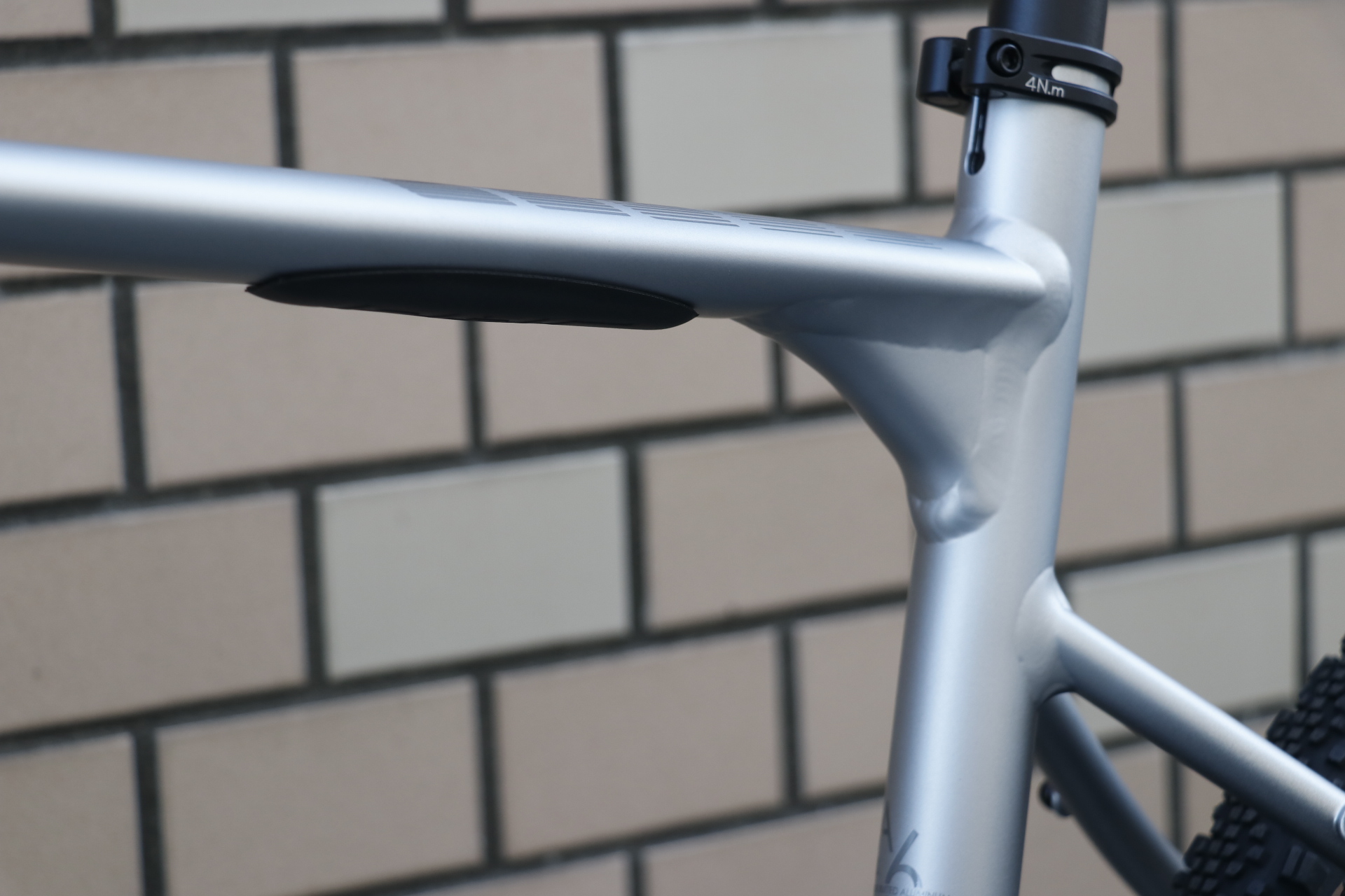 アドベンチャーライドにて山道に立ち寄る際、川を渡ったりトレイルを歩いたりと 走行不可能なエリアに遭遇する事も決して珍しくありません。ジャリフレームにはライダーの肩への負担の軽減を狙うべく2mmの厚さのシリコンパッドをトップチューブ下に標準装備しております。またトップ&シートチューブ接合部にガセットを配置する事で強度アップしております。