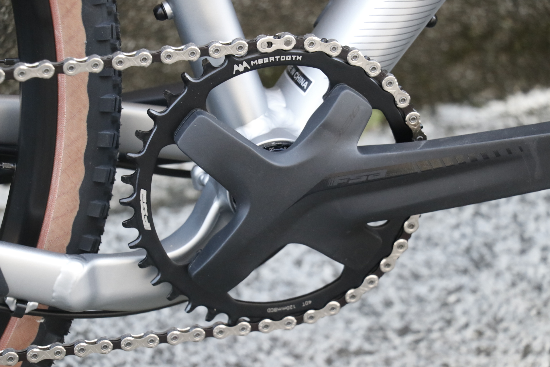 フロントシングルギア⇒ナローワイドチェーンリング。薄厚交互に配置されるギア歯によりダートコースでもチェーン外れ難くなっております。