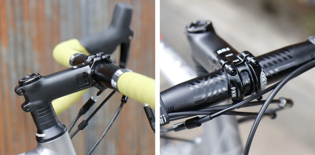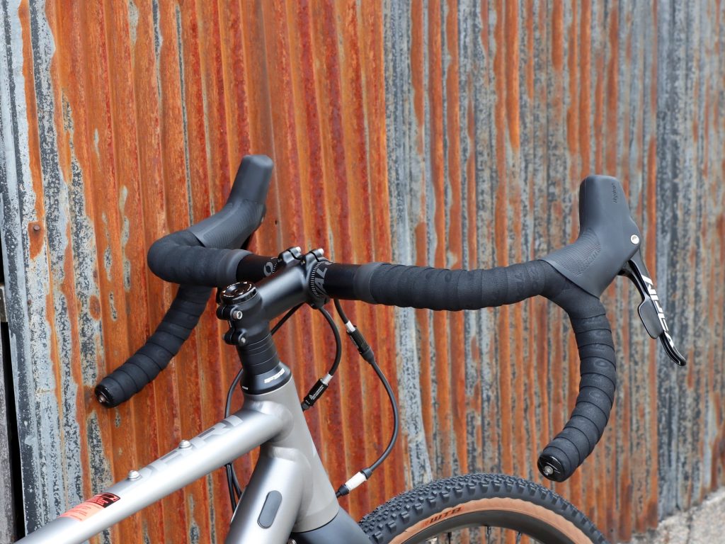 ハンドルにはこのバイクのために特別に作られたOVALのアドベンチャーバーを採用。ライダーの手首の角度を最適化しドロップ部分をより有効的にする為に一般的なロードタイプより20mm幅が広く、125mmドロップ、4度バックスウィープ、25度アウトスウィープ仕様となっており未舗装路でのバイクコントロール性が向上。