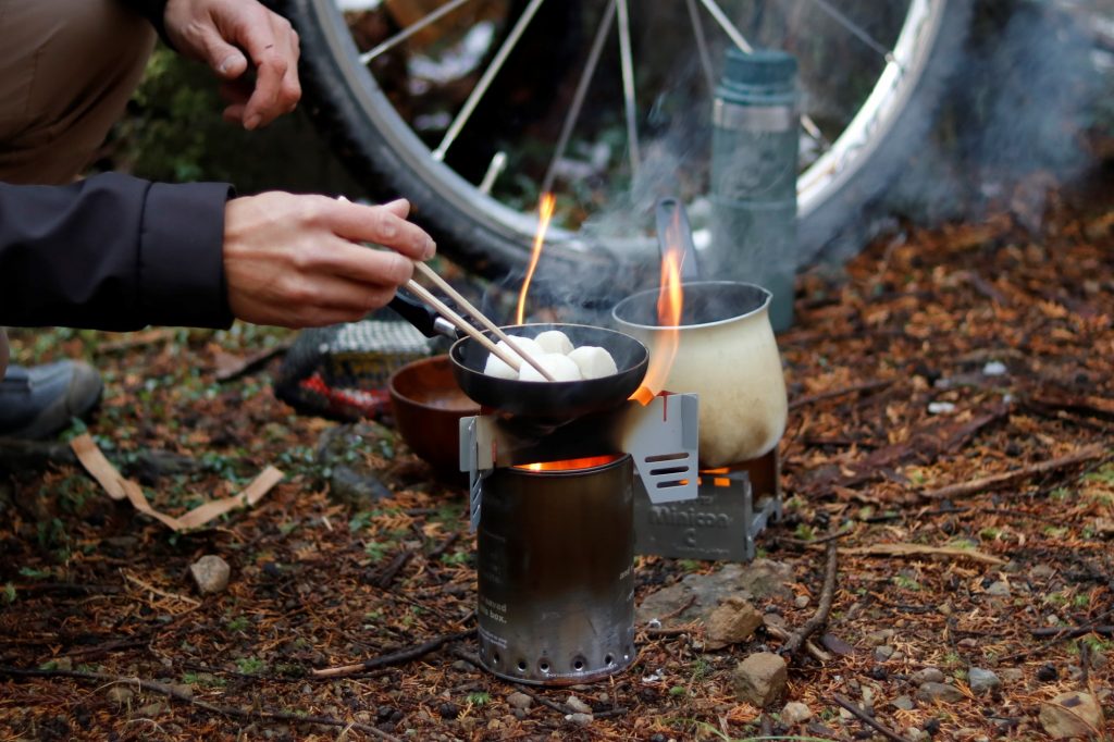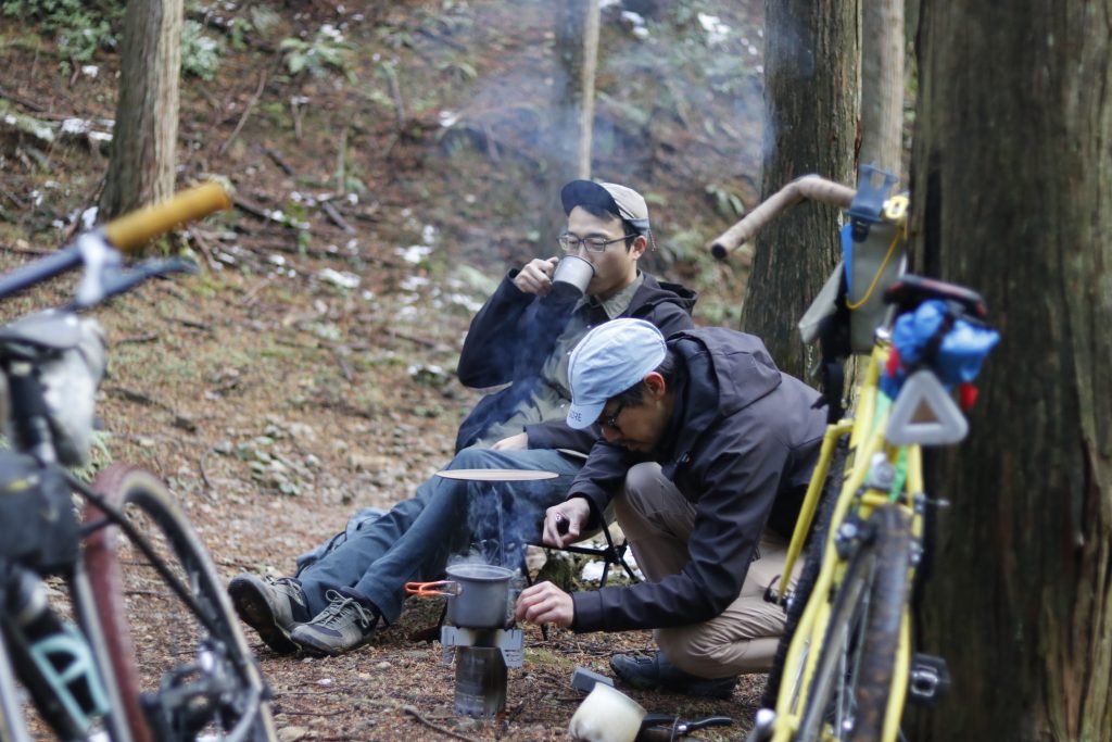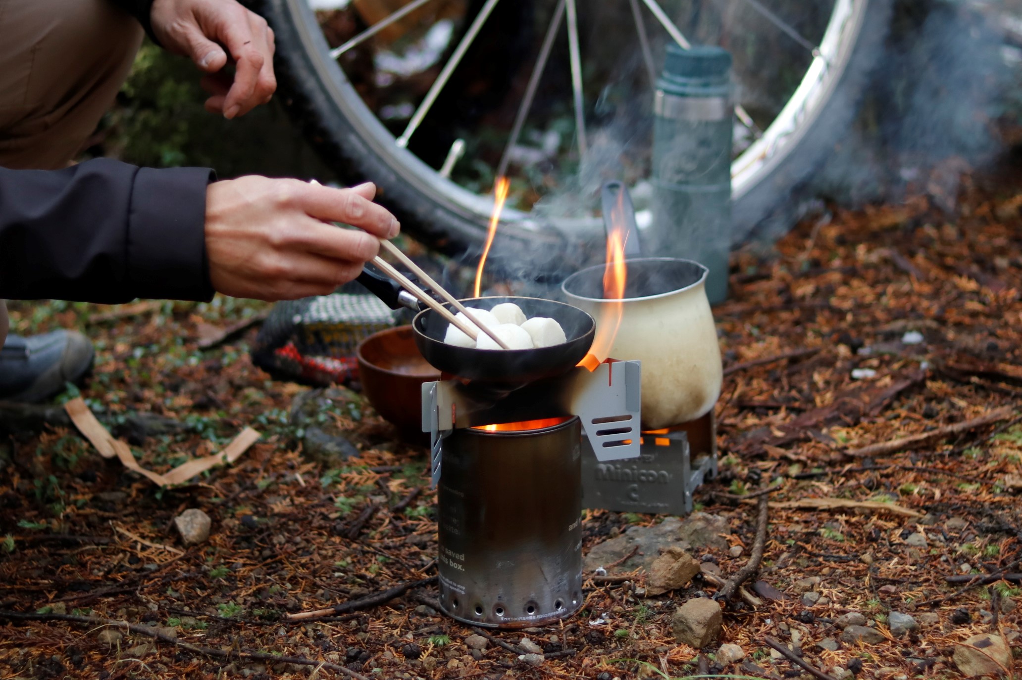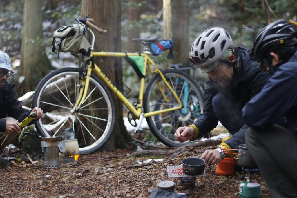 しばしのグラベルサイクリングを経て 適当な広場を見つけ、各自バイクパッキングアイテムから出てくるお気に入りのクッカー類で早速調理開始です~!
