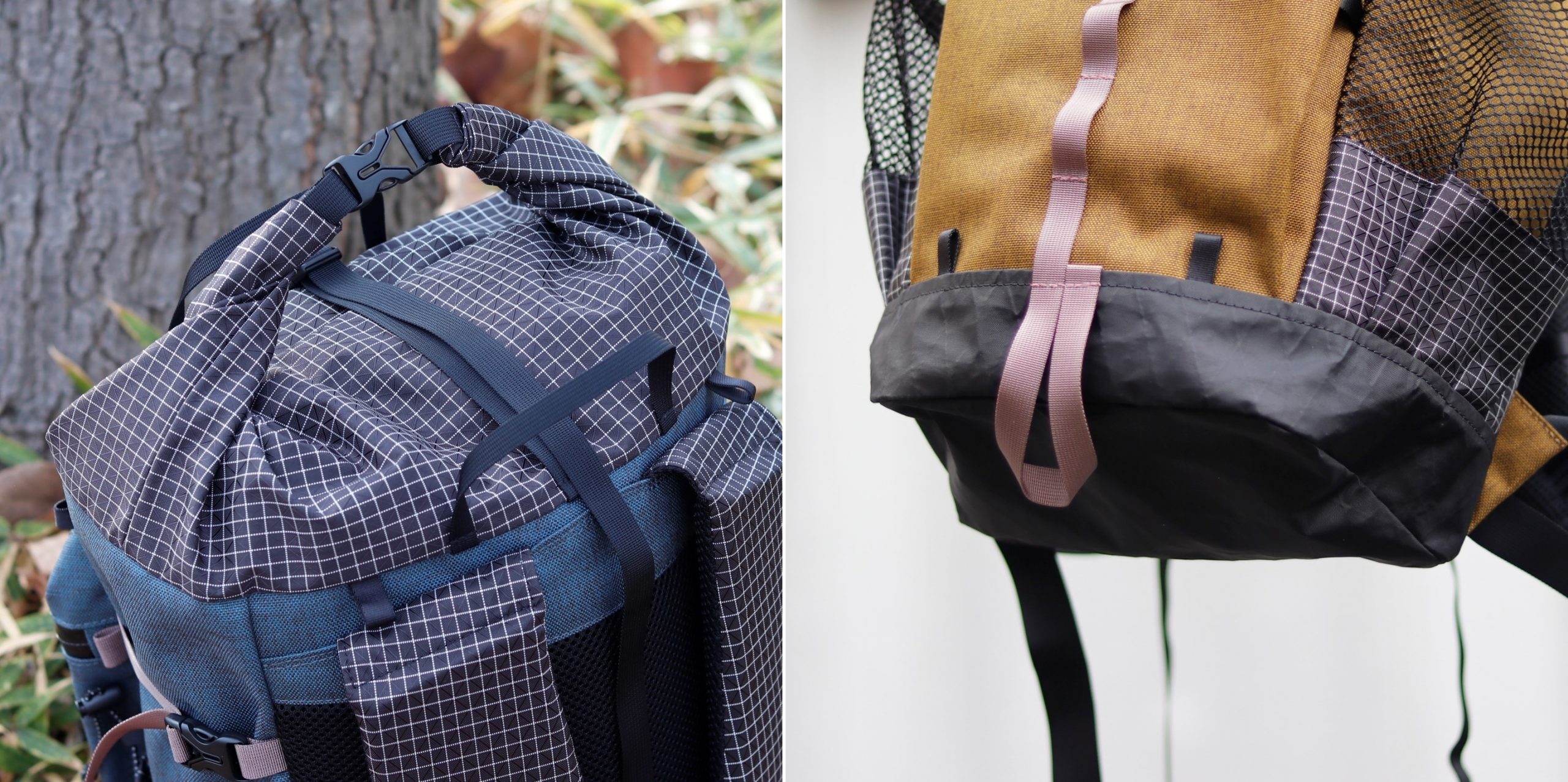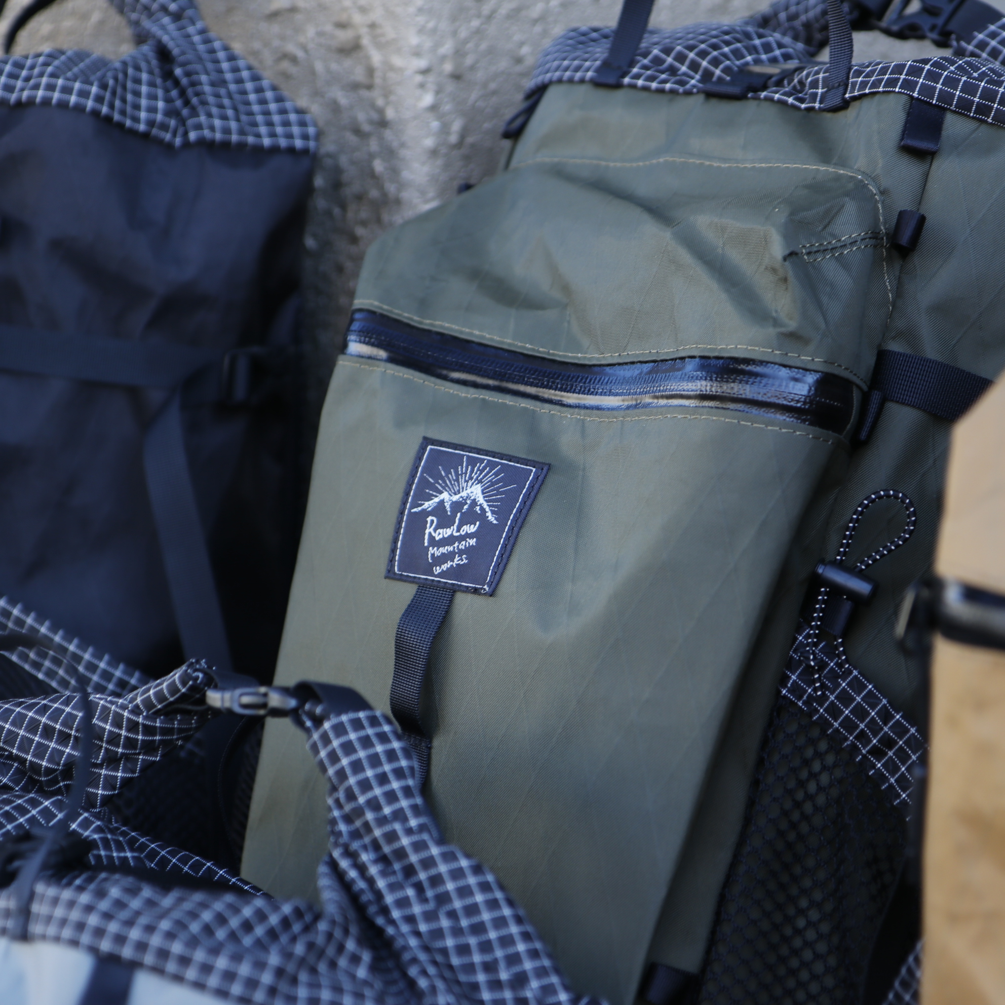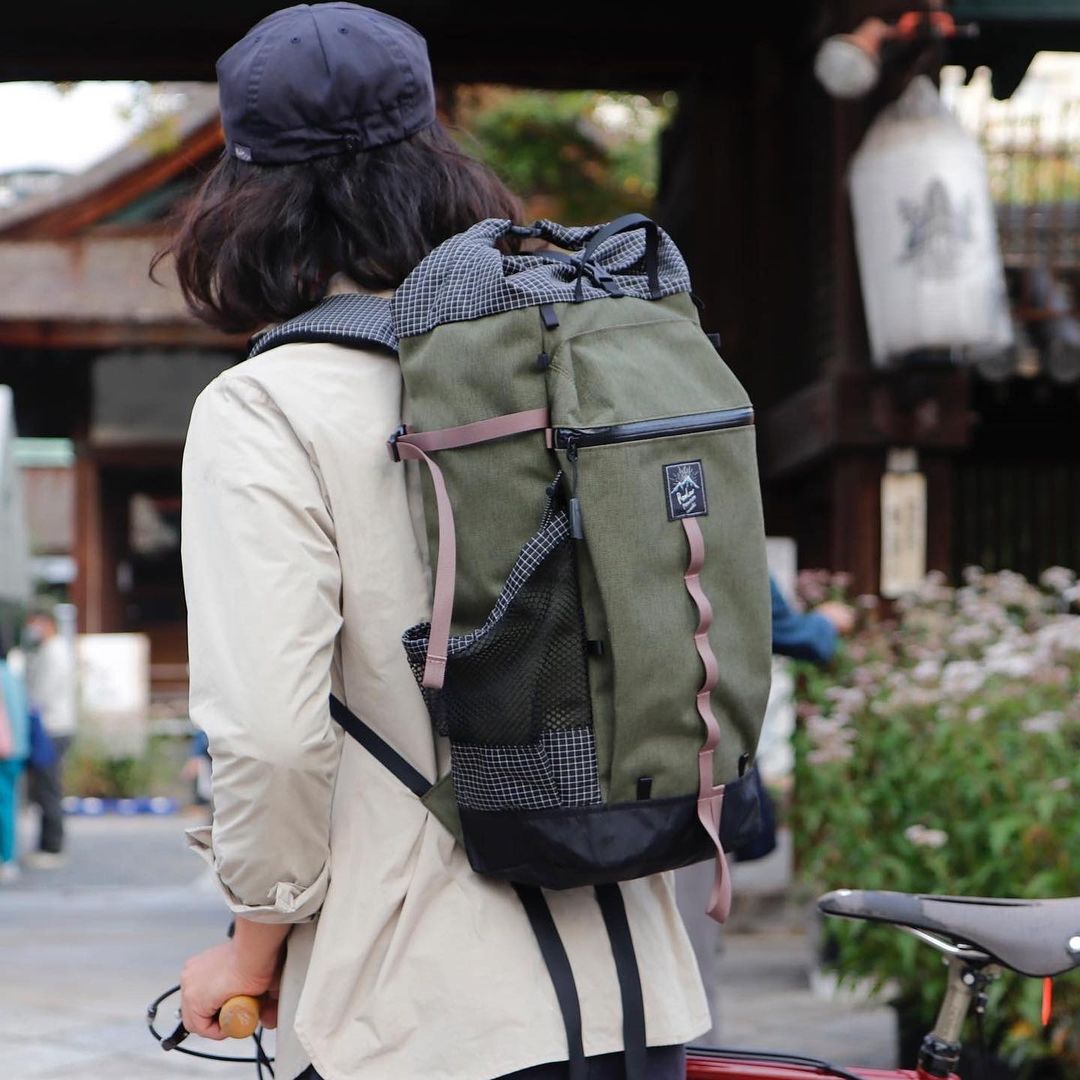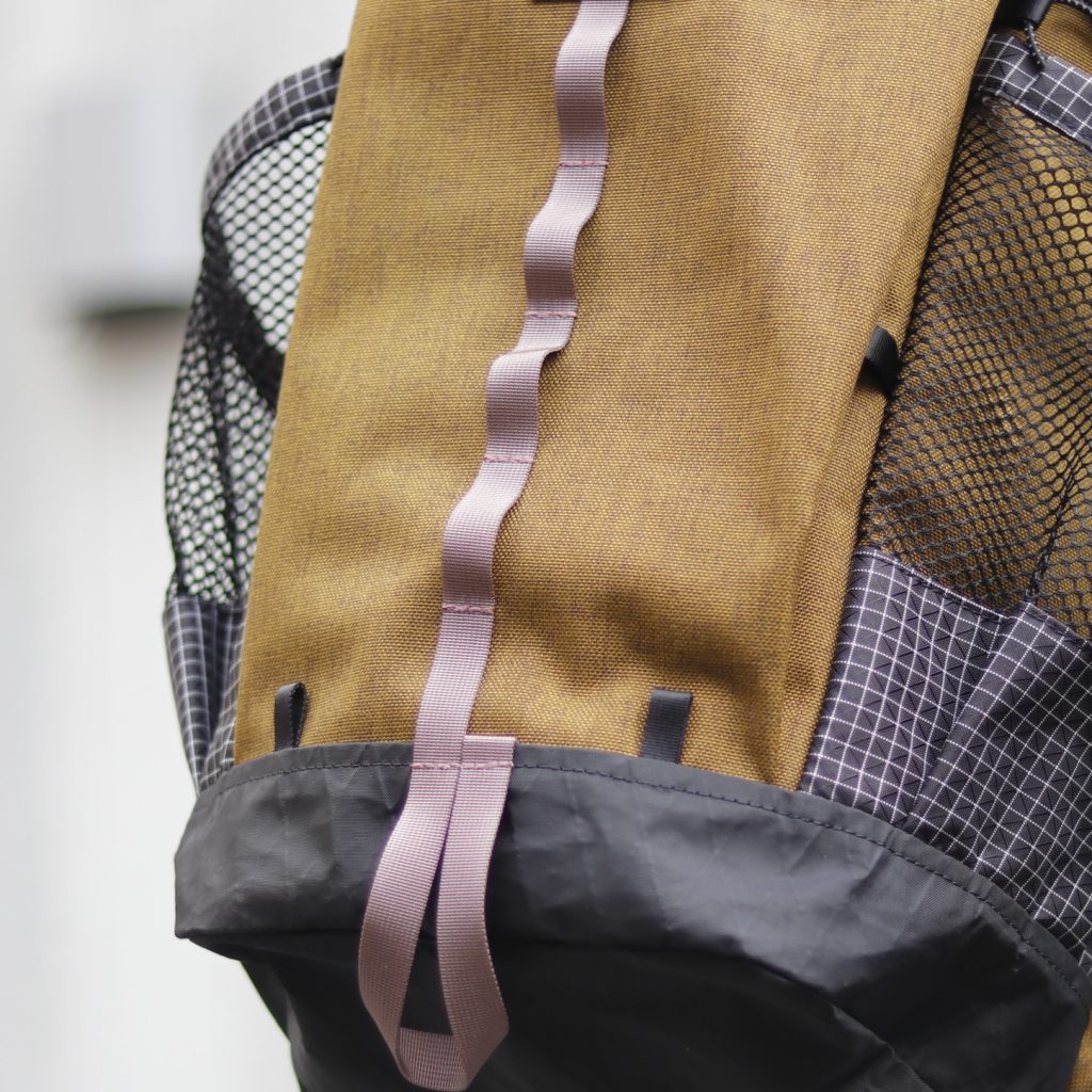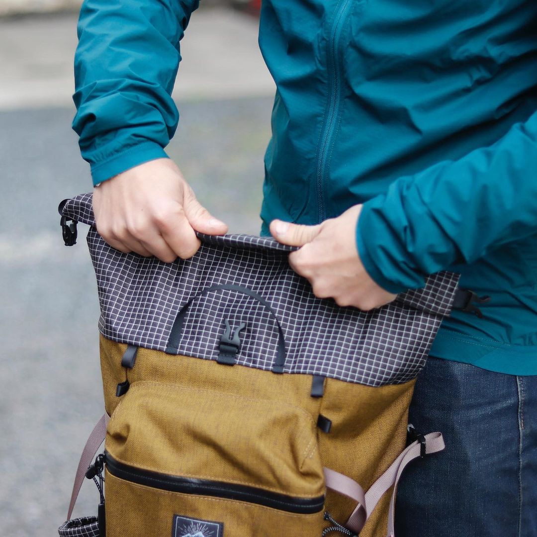 ポケットの底やロールトップ部など、柔軟性と強度の両立が必要な箇所には格子柄が目印のダイニーマX gridstopを、地面に接するボトムには引き裂き強度と防水性の高いX-PAC-VX21を使用。