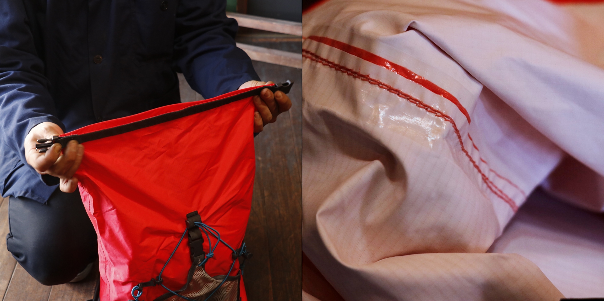 メインボディには210DPUリップストップナイロンを採用。縫い目にはシーム処理が施されており、確かな防水性を提供します。