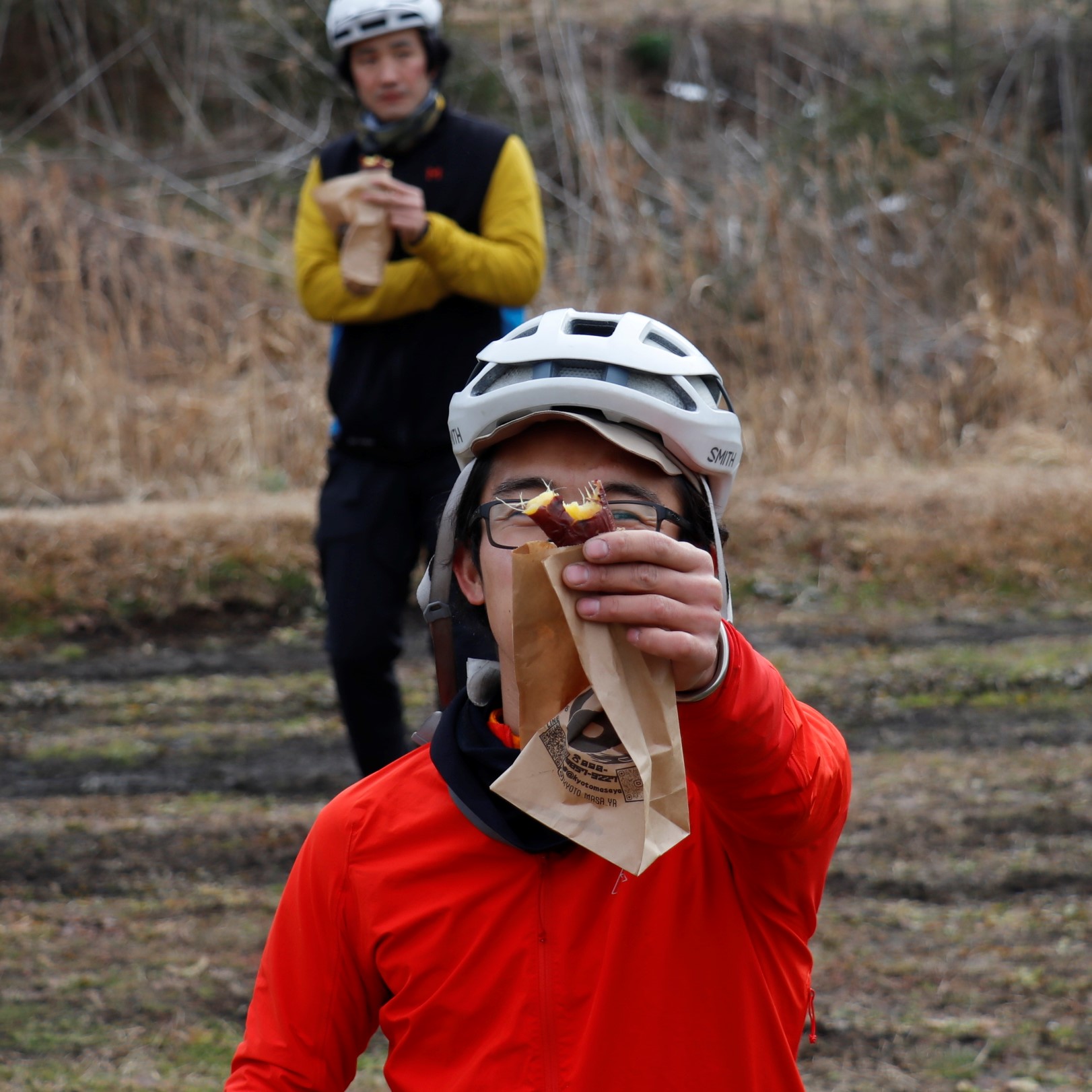 畑仕事が終われば、焼き芋食べたり・自転車談義に花を咲かせたりと休憩して、市内へカムバック!