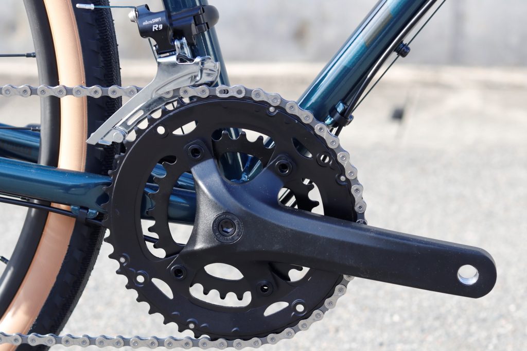 クランクセットはモダンな4アームのSAMOX(BBはノーブランド)、フロントディレーラーはMicro shift R9となっています。
