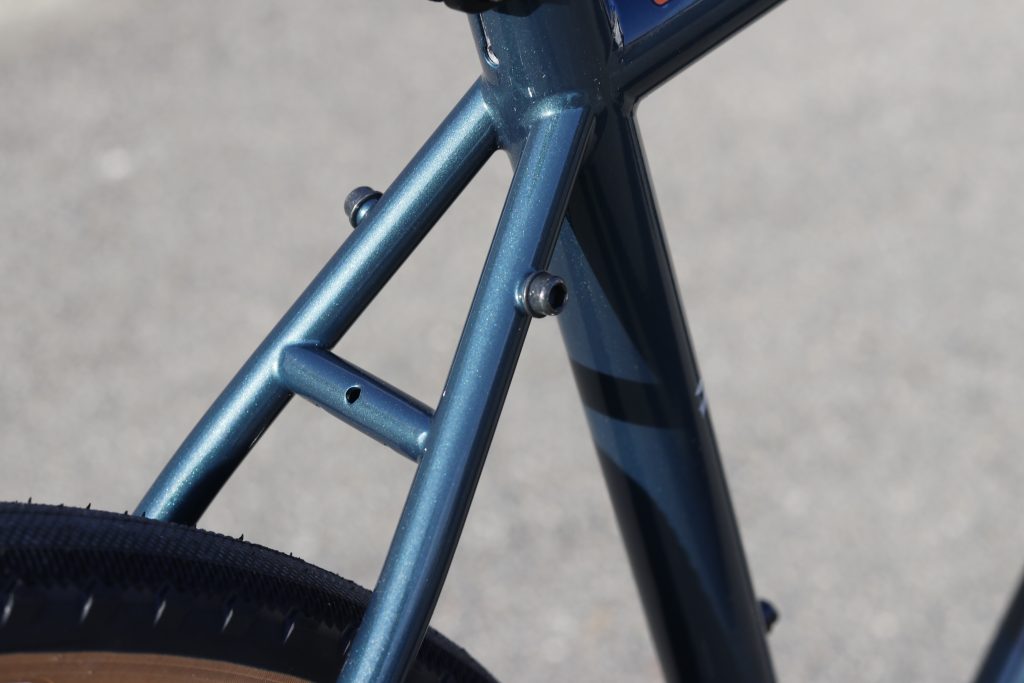 肩下長めのフロントフォークには多数のキャリア&フェンダーダボが用意されており、ほとんどのキャリア/ラックに対応するので、選択肢幅広く選べます。