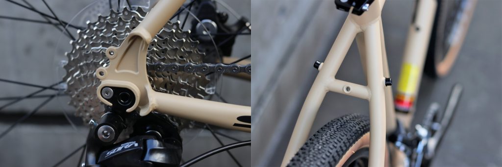 前後共にキャリア・フェンダー両取付OK、通常のシート/ダウンチューブのボトル台座に加え、ダウンチューブ裏・トップチューブ上にもボトル台座を用意。