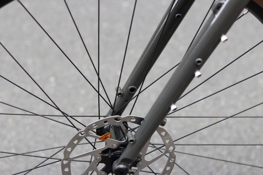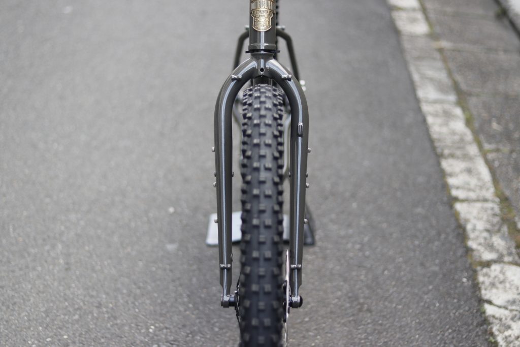 フォーク:ユニクラウン、スティール製。110×15スルーアクスル。上部と底部にラックマウント、フェンダーマウントあり。トリプルケージマウントがフォークレッグ左右に。ダイナモワイヤー対応。