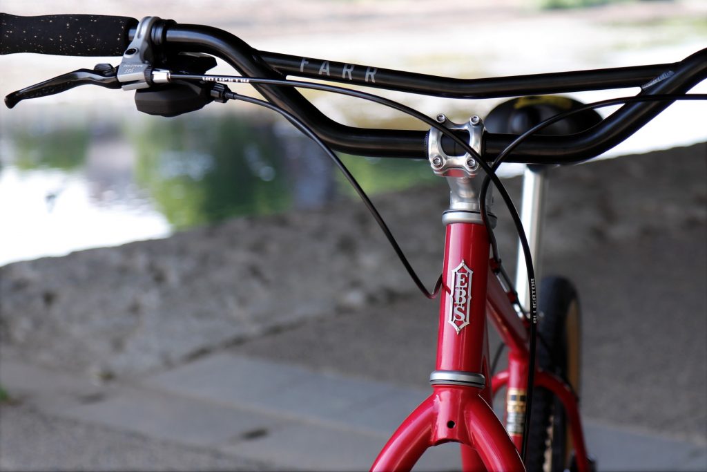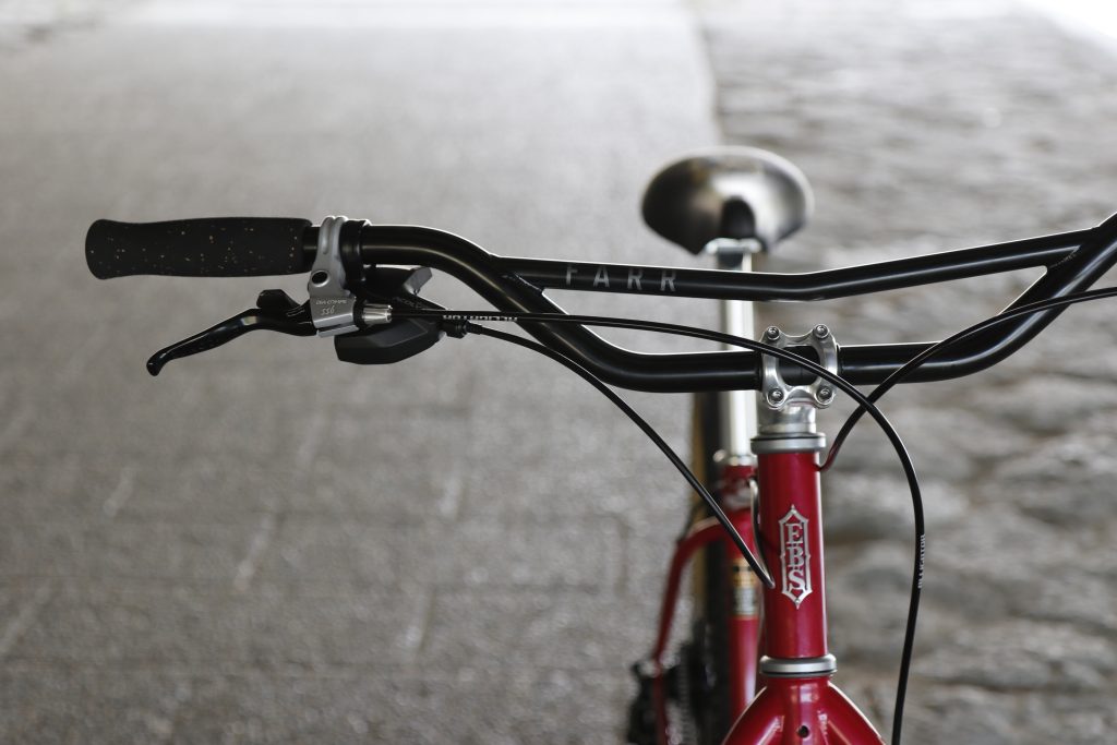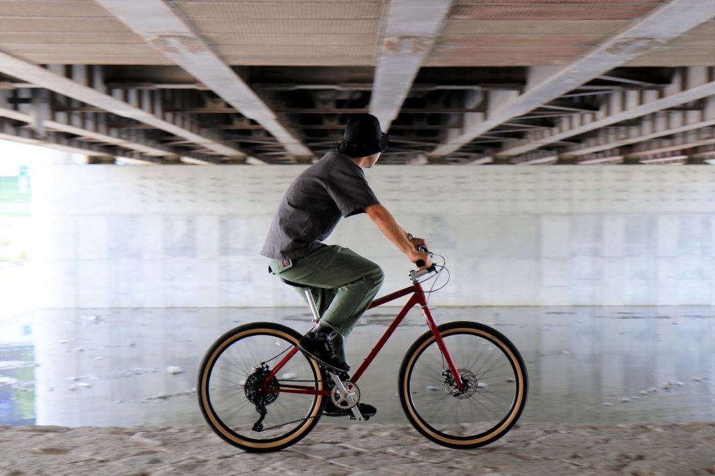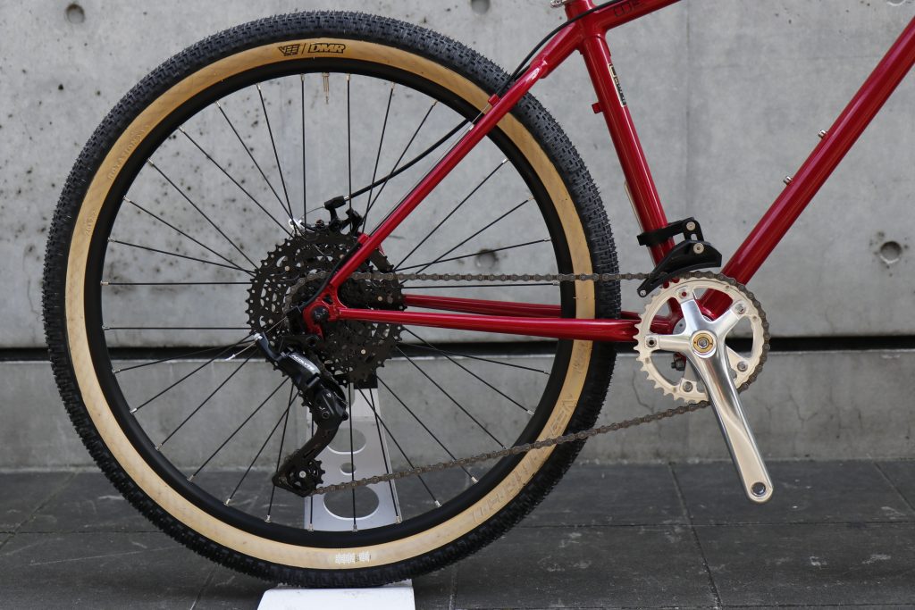 80’Sライクなクランカータイプのハンドル、シンプルな操作性が気楽なリアのみの変速ギア、またあえてゴツゴツとしたMTBタイヤではなくオンロードの転がり軽いBMXタイヤで構成して一台限りの完成車とさせて頂きました。