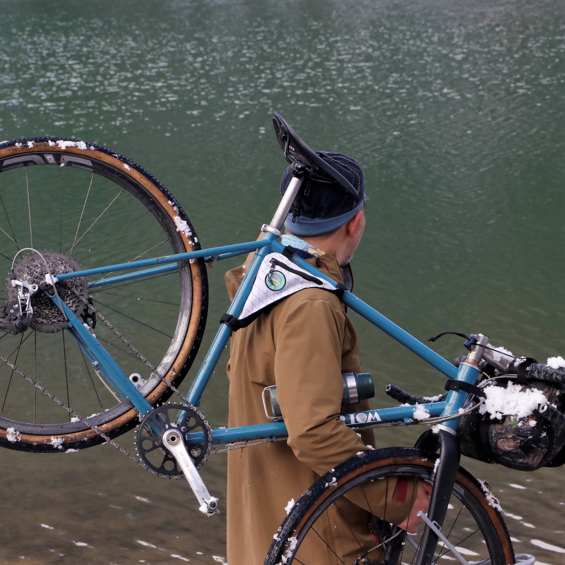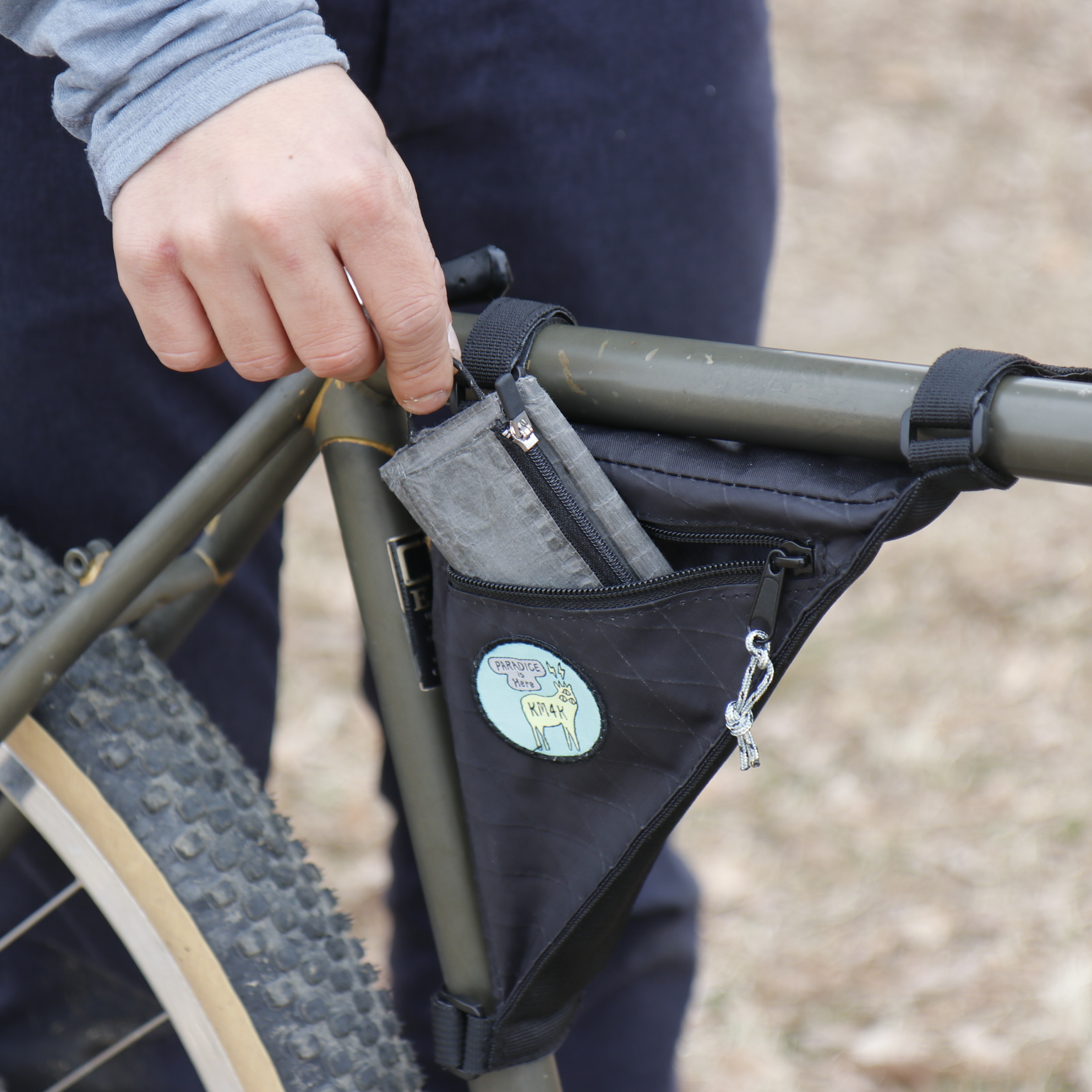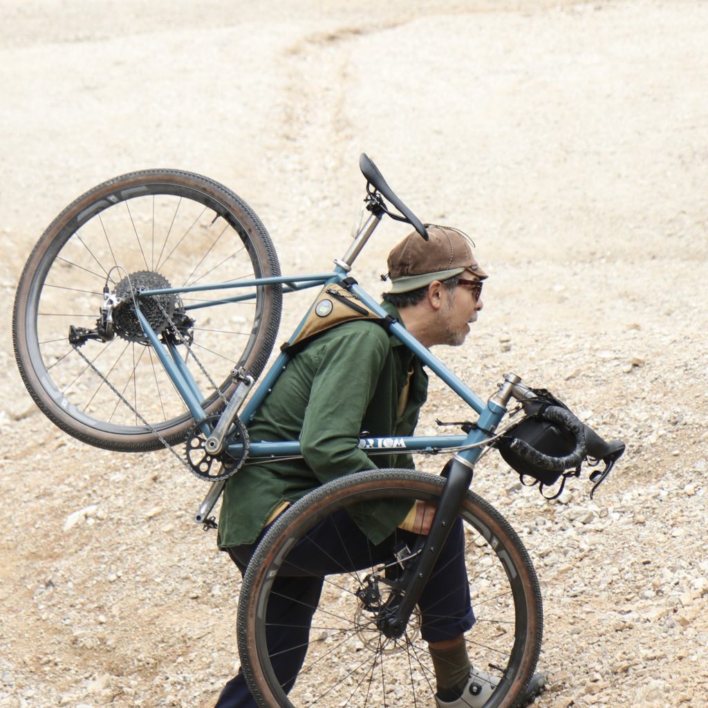小物の収納に便利なのは勿論、山や川 荒れた路面など走行困難な区間で、自転車の担ぎを助けてくれる “ショルダーパッドが配されたフレームバッグ”。