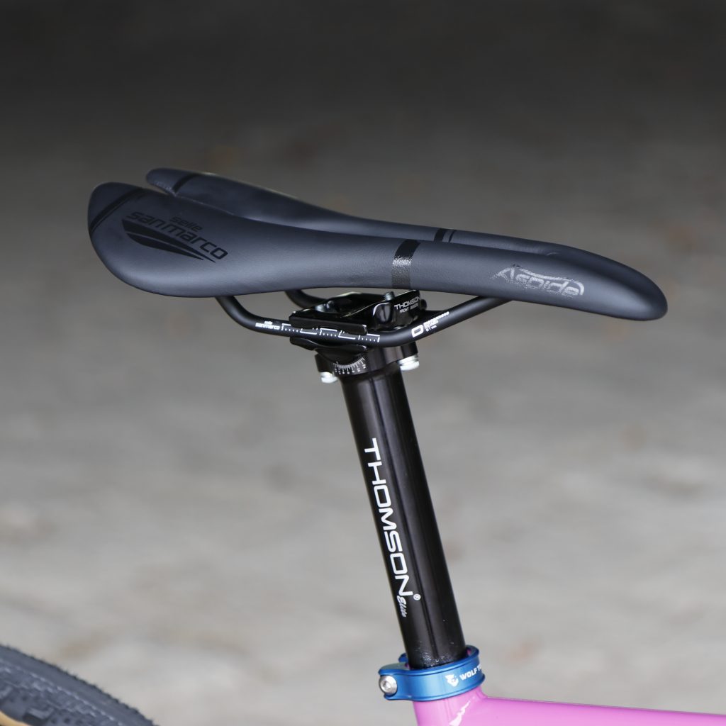 サドルには、重量:210grと軽量性をも寄与する薄く美しいフォルム&絶妙なしなりを生みお尻への負担を軽減するSELLE SANMARCO Aspide RACING DYNAMIC。 シートポストには、CNC加工による高い精度と美しさに加え 高剛性と軽量性を両立する名作THOMSON ELITEを。