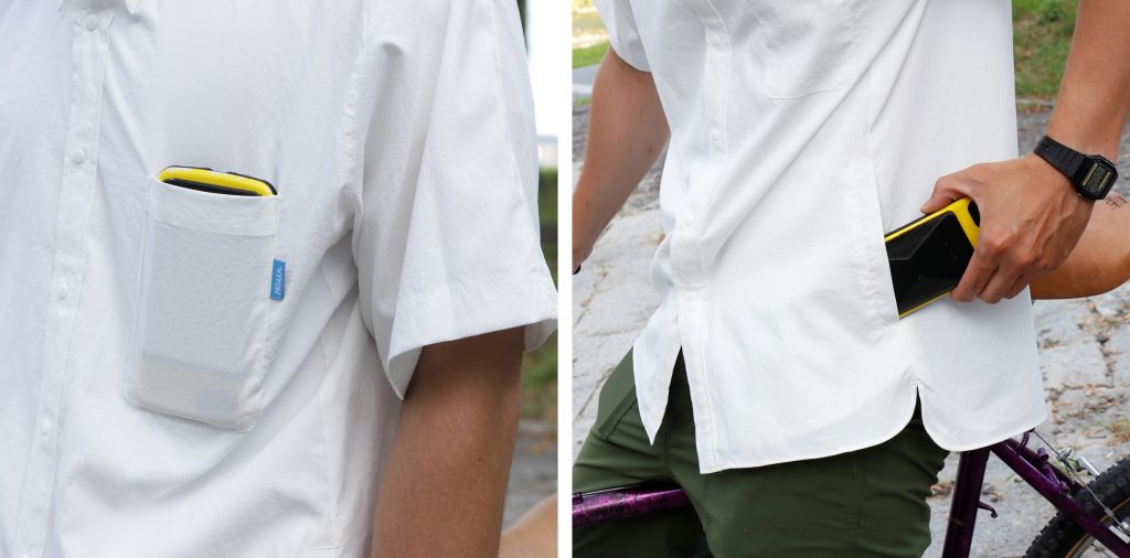 サラッと軽ろやか、そして程よい伸縮のおかげで、スッキリとしたシルエットのボタンシャツでも、後述の裁断と合わせて、ストレスフリーにアクティビティを楽しむ事が出来ますね。