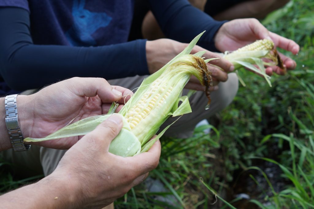 同じ畑をシェアレンタルする家族連れに交じり我々もトウモロコシ収穫祭を執り行いました。