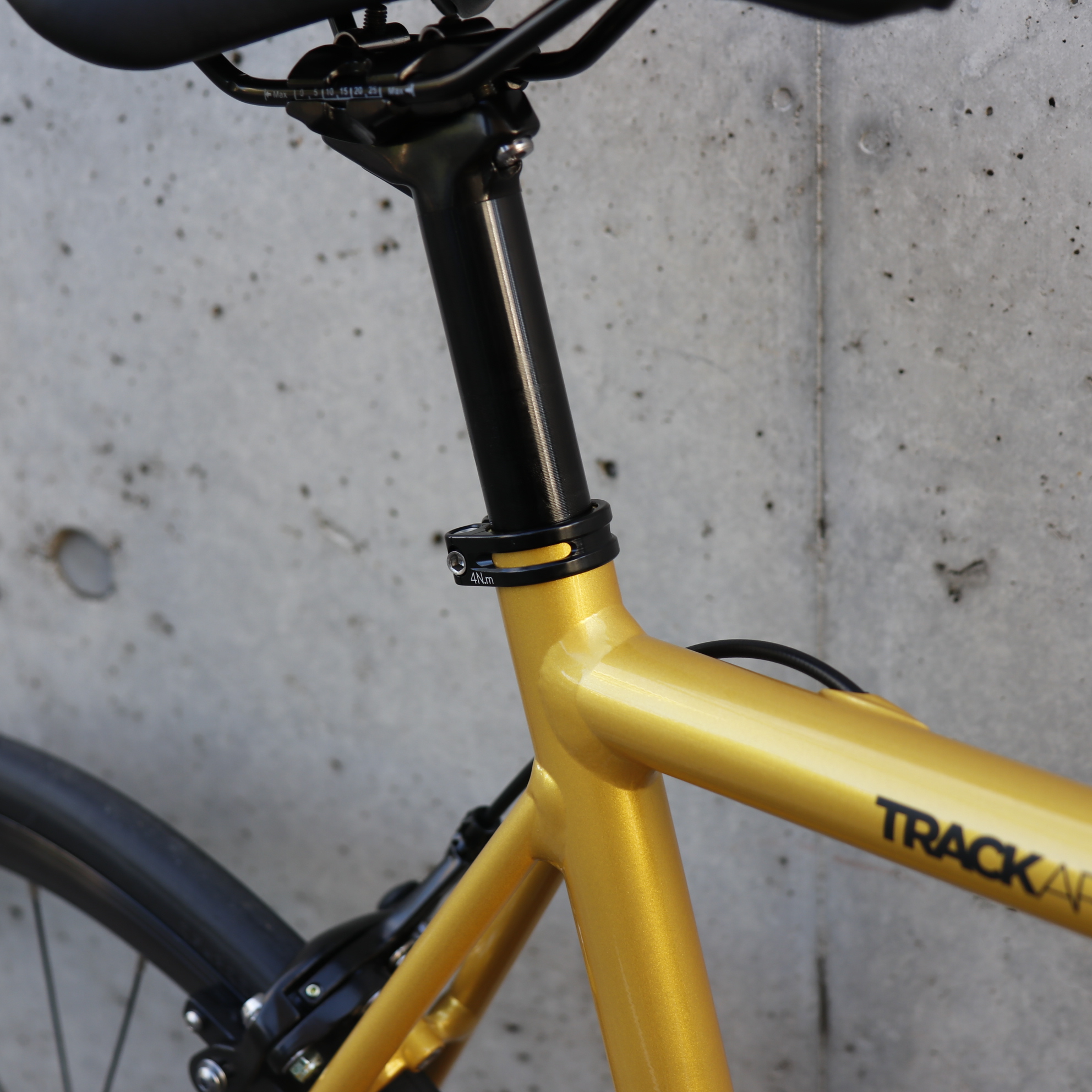 標準仕様はトラックバイク用のなで肩なドロップハンドルとなっていますが、ブルホーンやライザー、プロムナードバーなどなど自由なカスタムが楽しめるのも街乗りシングルスピードの面白いトコロ。