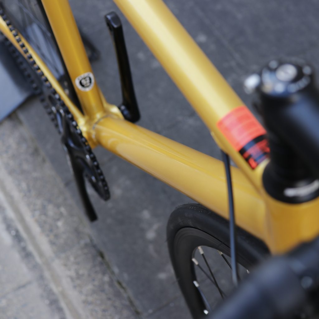 極太のダウンチューブはペダリングパワーを余すことなく推進力へと変換し、キレッキレのシャープな加速感がクセになります。