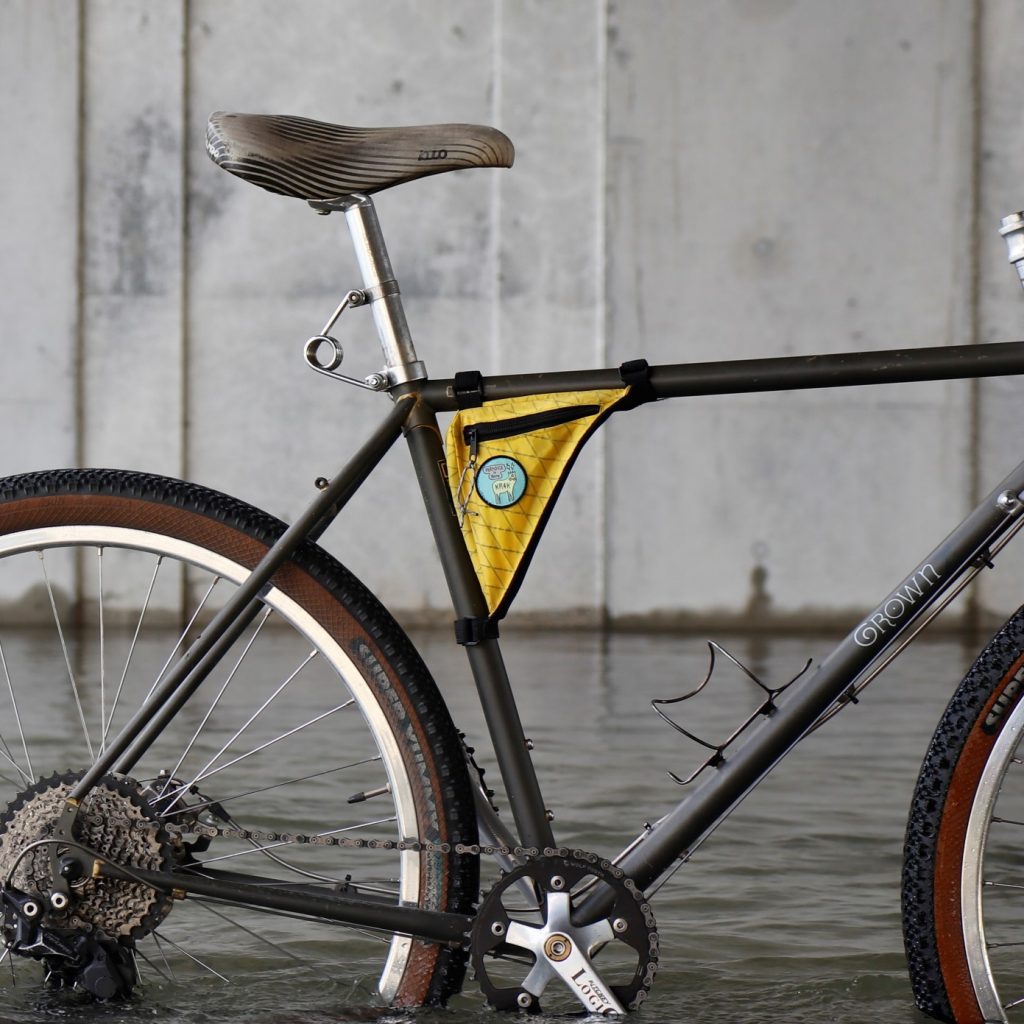 KM4K x サイクルハテナ コラボレーション~PASS HUNTER BAG~: 8-90年代、世界中を席巻したMTBカルチャーのワクワクしたあの頃の初期衝動アゲイン!! の意を込めたBack From The Grave Gear !!小物の収納に便利なのは勿論、山や川 荒れた路面など走行困難な区間で、自転車の担ぎを助けてくれる “ショルダーパッドが配されたフレームバッグ”
