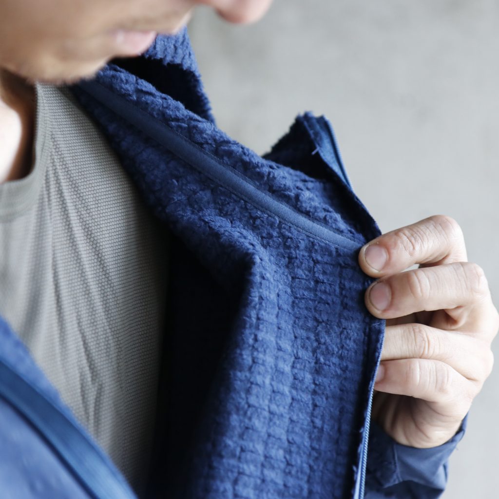 内側にはグリッド状に配置された起毛素材。衣服内に暖かい空気を溜め込みつつ湿度を外に逃がす空間が生まれます。