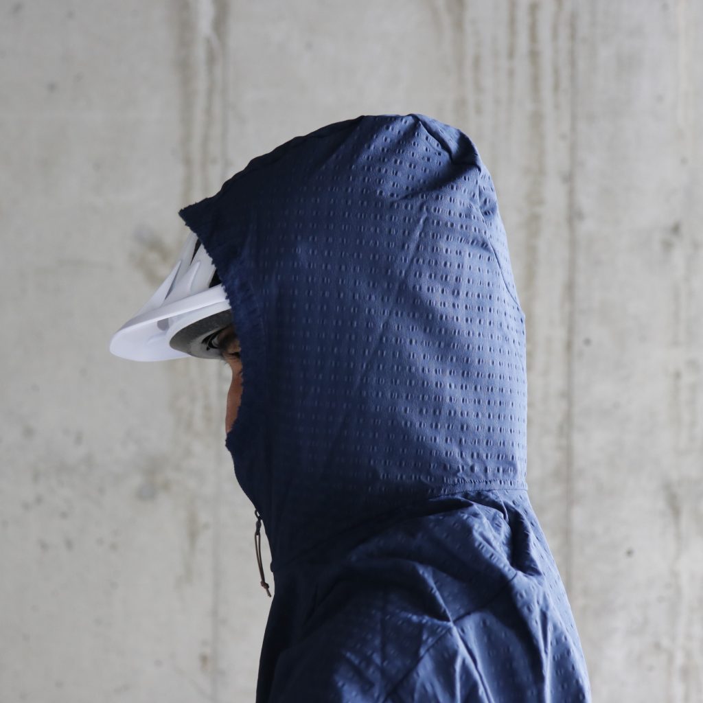 快適な構造のフードには伸縮性があり、ヘルメットの上から被れる程。