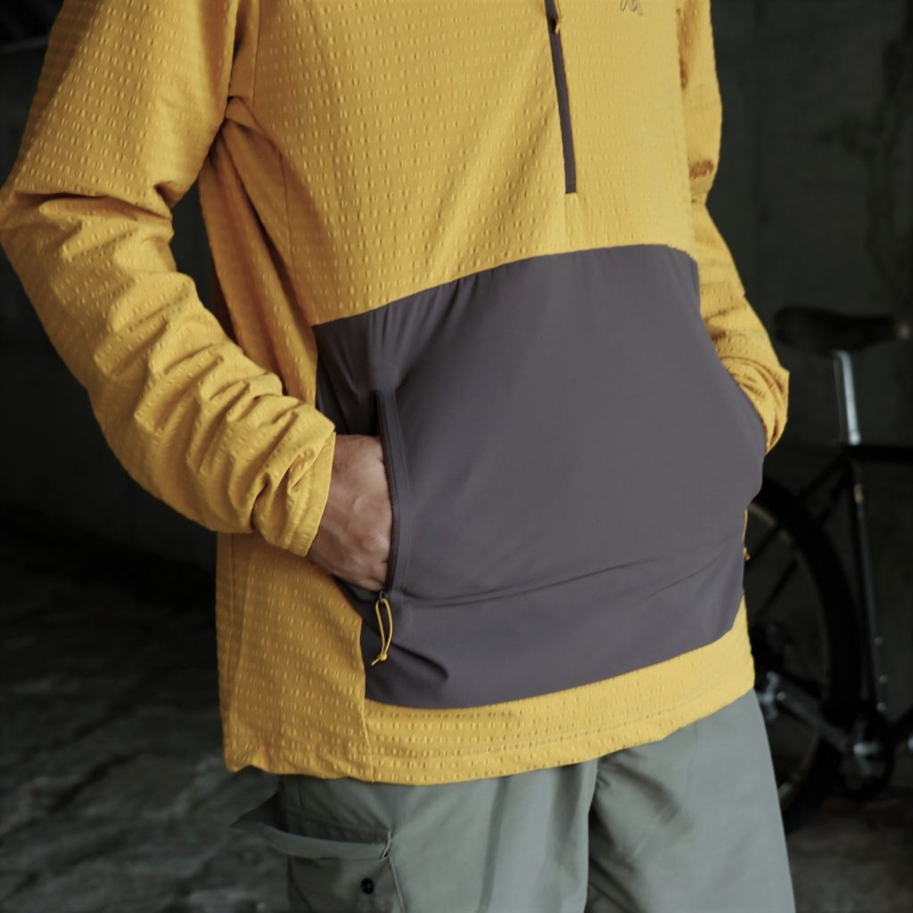 ハーフジップにカンガルーポケットとカジュアルな出で立ちのアノラック。