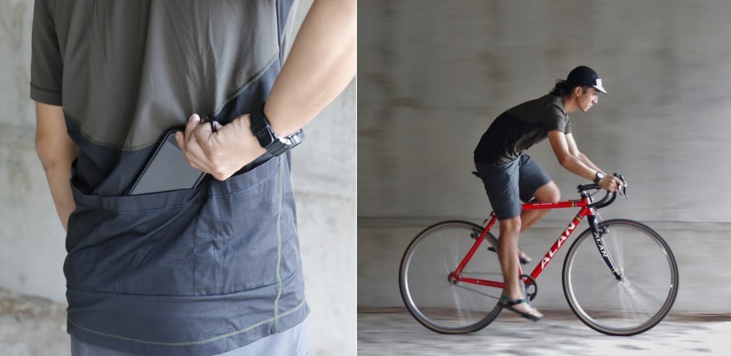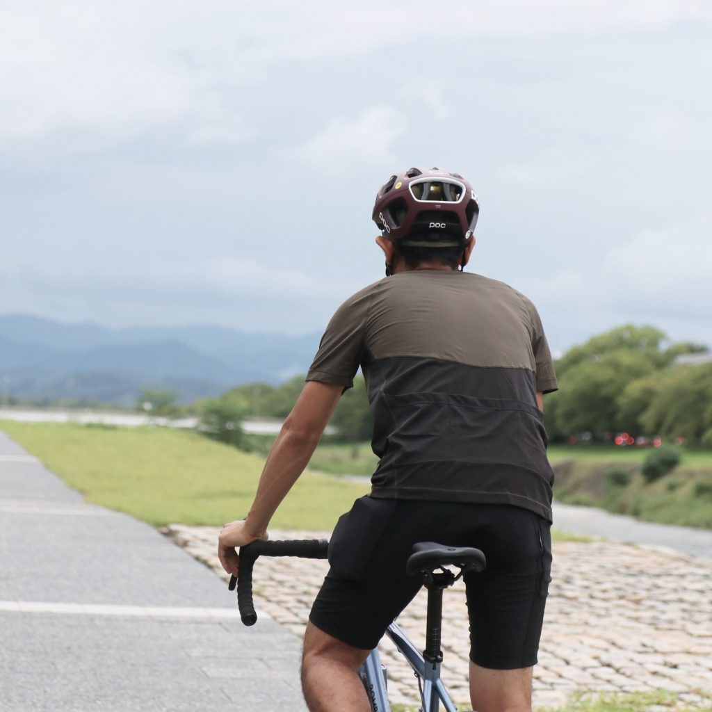 自転車に乗った際の前傾姿勢時にも肩まわりの動きを限定しない設計です。