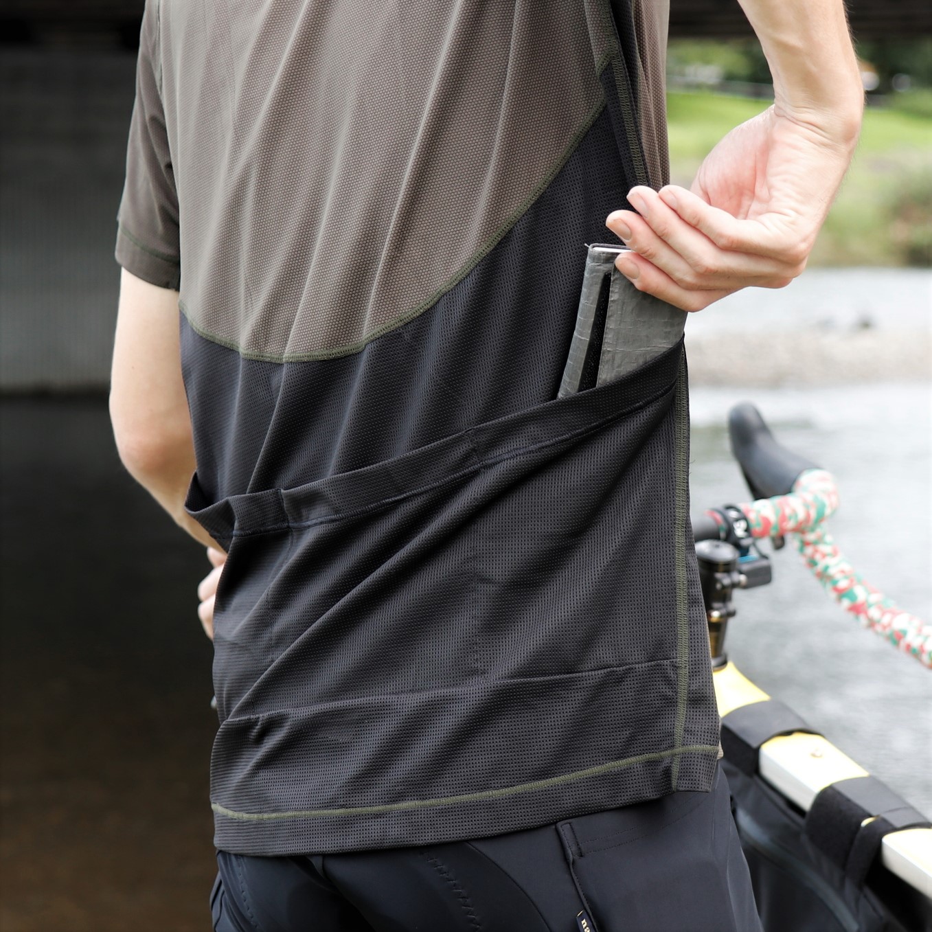 背面には通気性の良いメッシュ素材を使用。サイクルジャージからインスパイアされたバックポケットを備え、収納性とサイクルアパレルとのコラボレーションならではのデザイン性を表現しました。