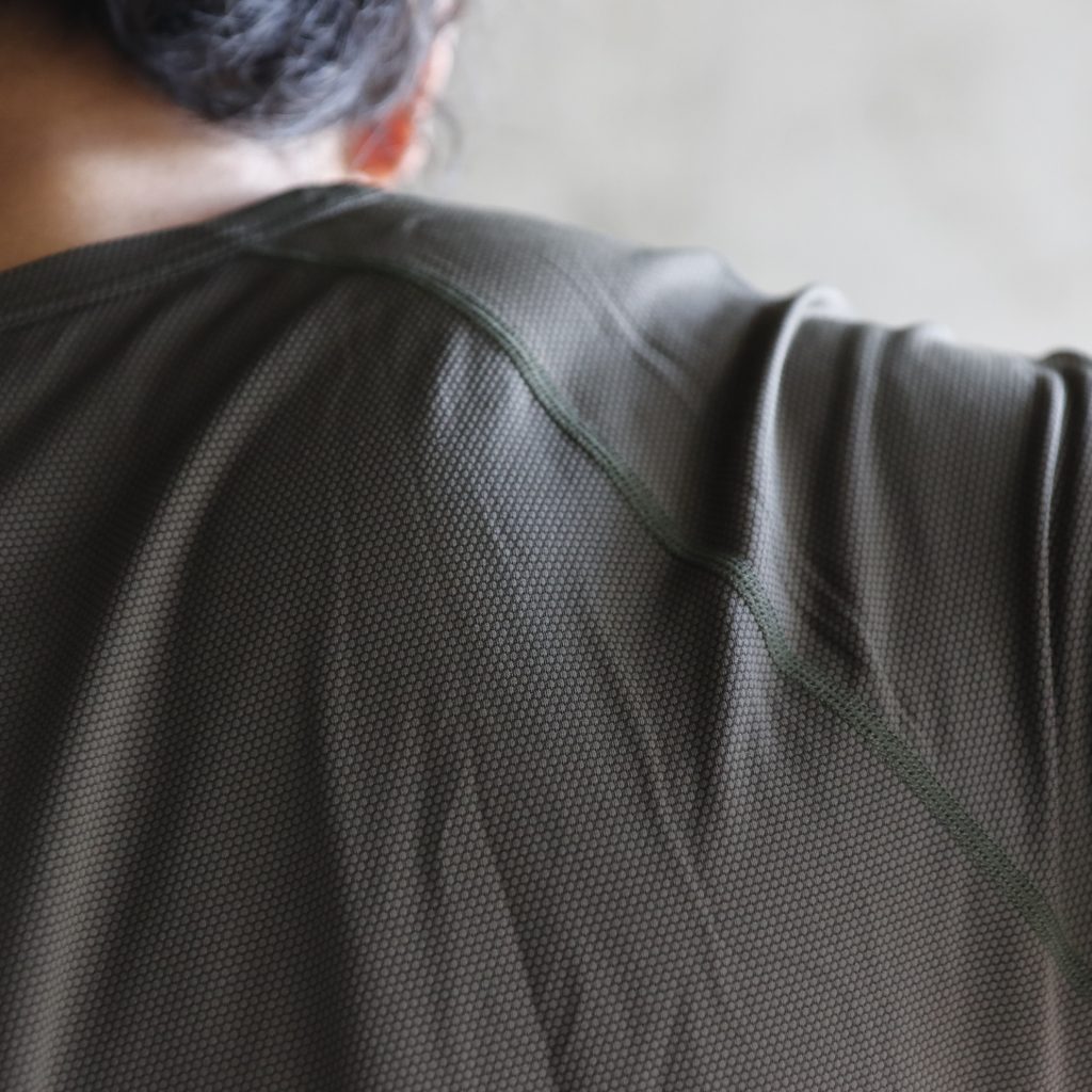 見た目はカジュアルなTシャツの雰囲気でありつつも、スプリットラグランスリーブを採用することで腕の可動域を確保。