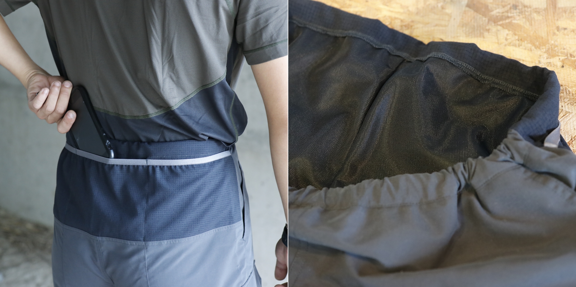 汗が溜まりやすい後身腰部分にはメッシュ生地を使用し通気性をUPし、鍵や行動食などを収納するのに便利な3連ポケットが配備。