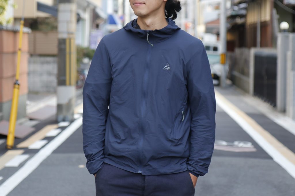 リップストップナイロンに、DWR撥水加工を施したシンプルな112gのウインドブレーカーは、非常に軽く・畳めばコンパクト(パッカブル仕様)。