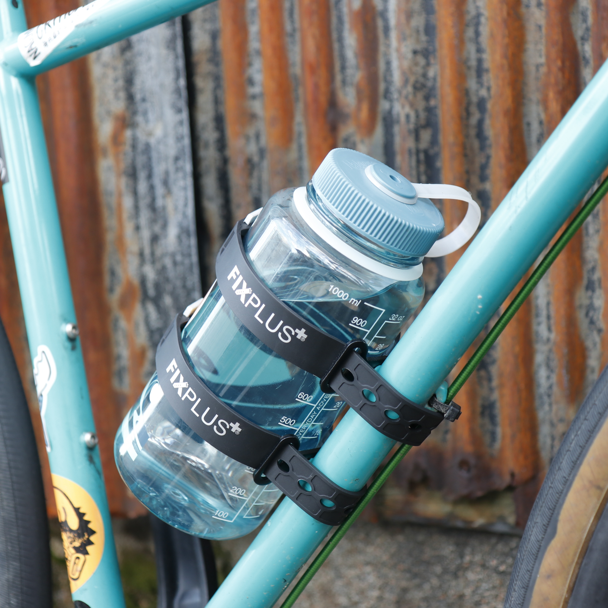 ストラップ2本とフレームのボトルケージ台座に取り付けるアルミ製金具2個のセット。