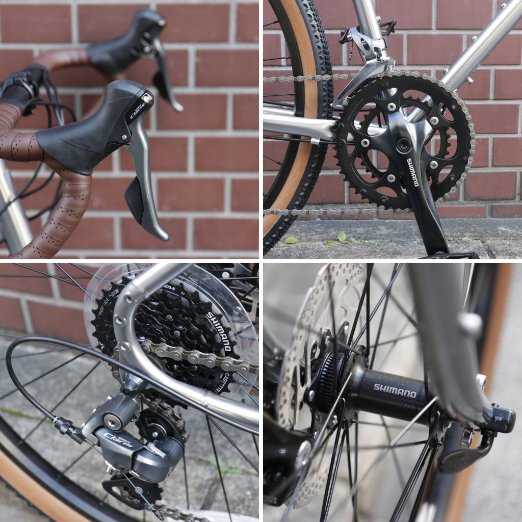 安心の精度をもつSHIMANO製クラリス2x8SPEEDコンポを軸に、仕様頻度高いハブ、クランク、BB、カセットにまでSHIMANO製を採用。