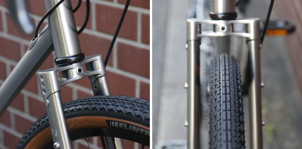 ユ〇クロ的ただのシンプル自転車ではないぞと主張する特徴的な二枚肩のラグフォーククラウン。タイアクリアランスも十二分。