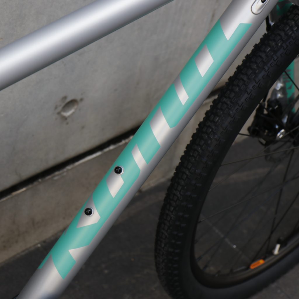 そこに合わせる ターコイズカラーのロゴもKONAの「自転車で楽しむ」世界観がバッチリ表現されています。