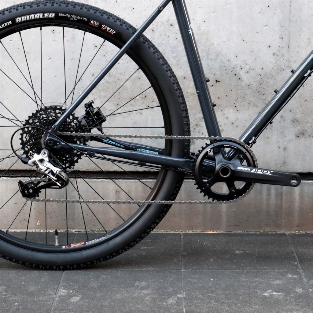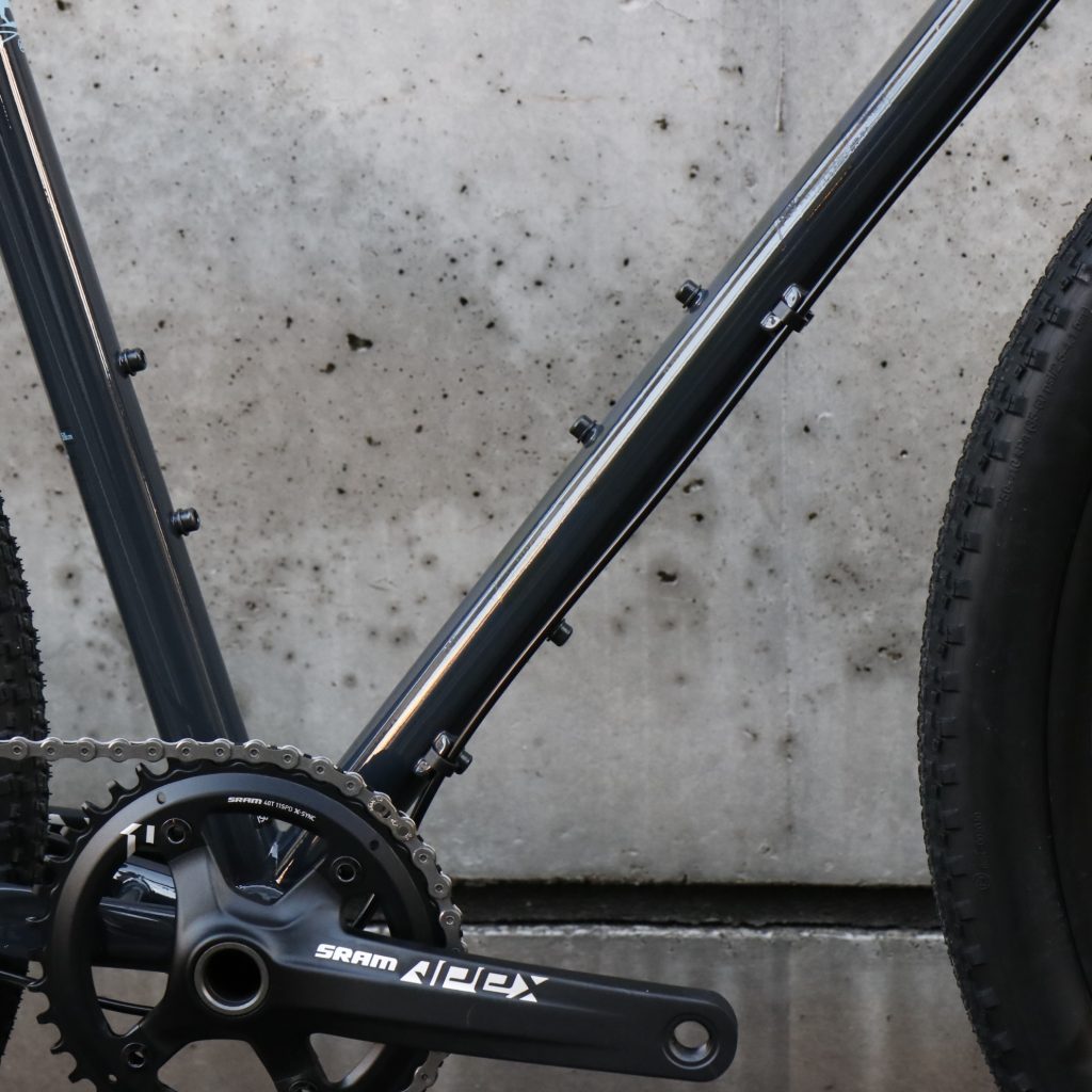 チェーン落ちのリスクを抑えたフロントシングルの利点を活かしつつ、グラベルライド~荷物が嵩張るキャンプツーリングまで楽しめる内容です。