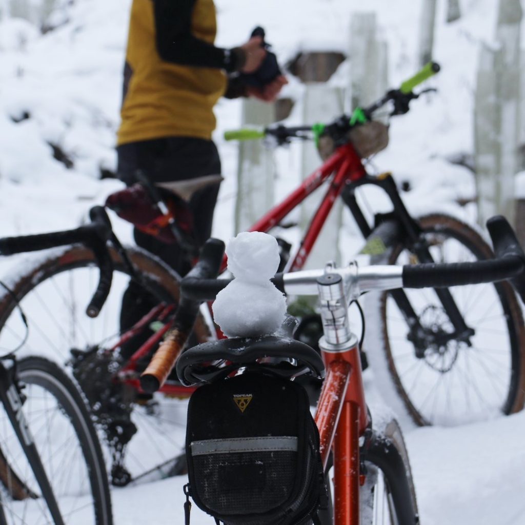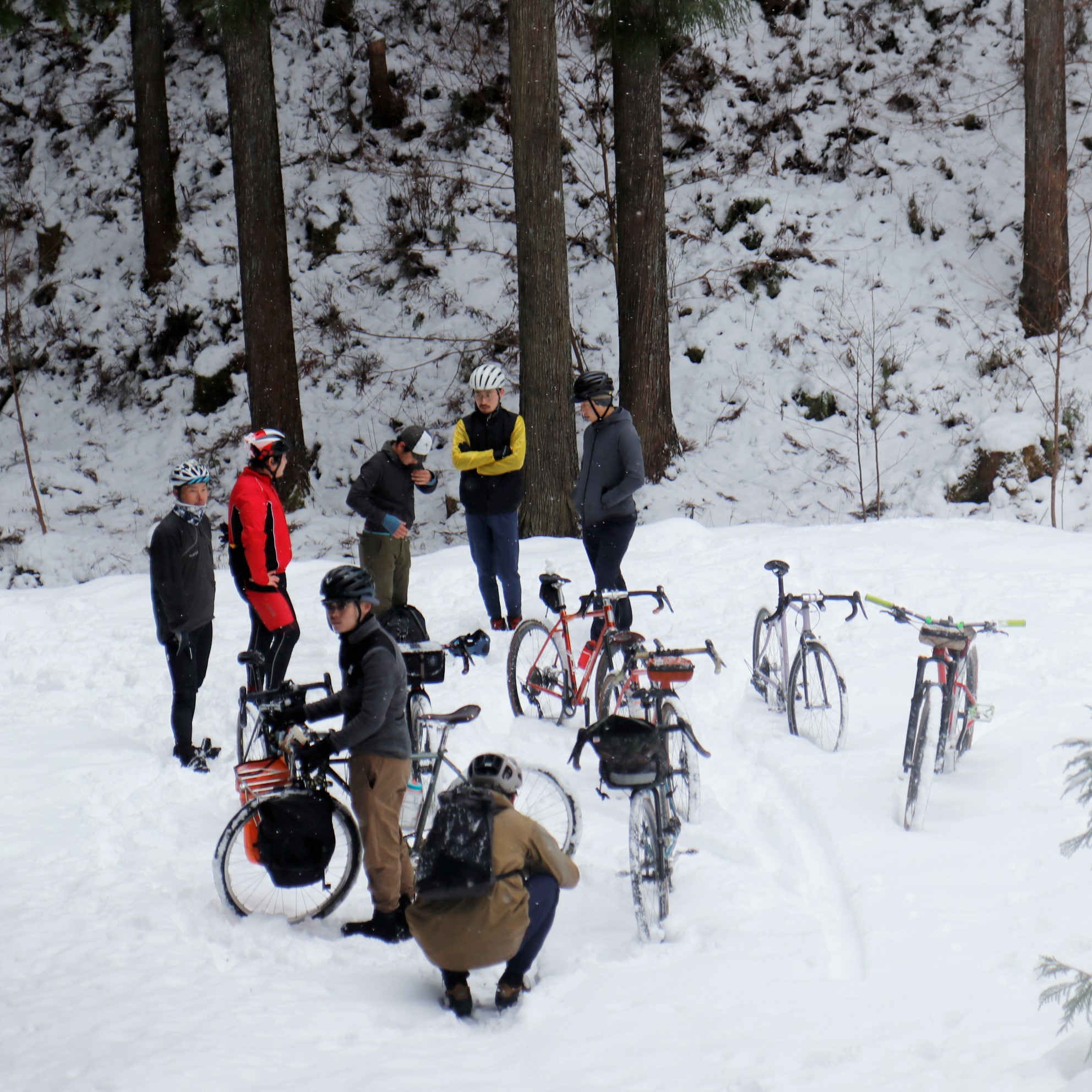 ピークでは自転車が自立するほど積もった雪、並べて立ててしばし歓談。