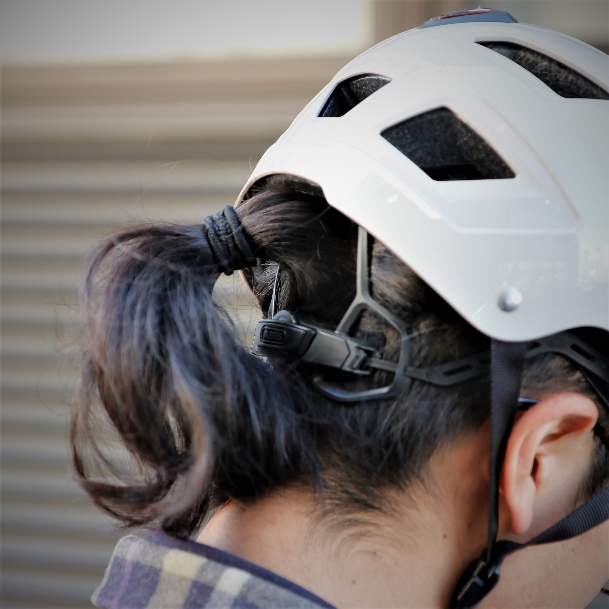 後頭部のダイヤルは片手で簡単に操作でき、フィット感の調整も簡単です。ポニーテールにも対応する女性サイクリストにも最適です。