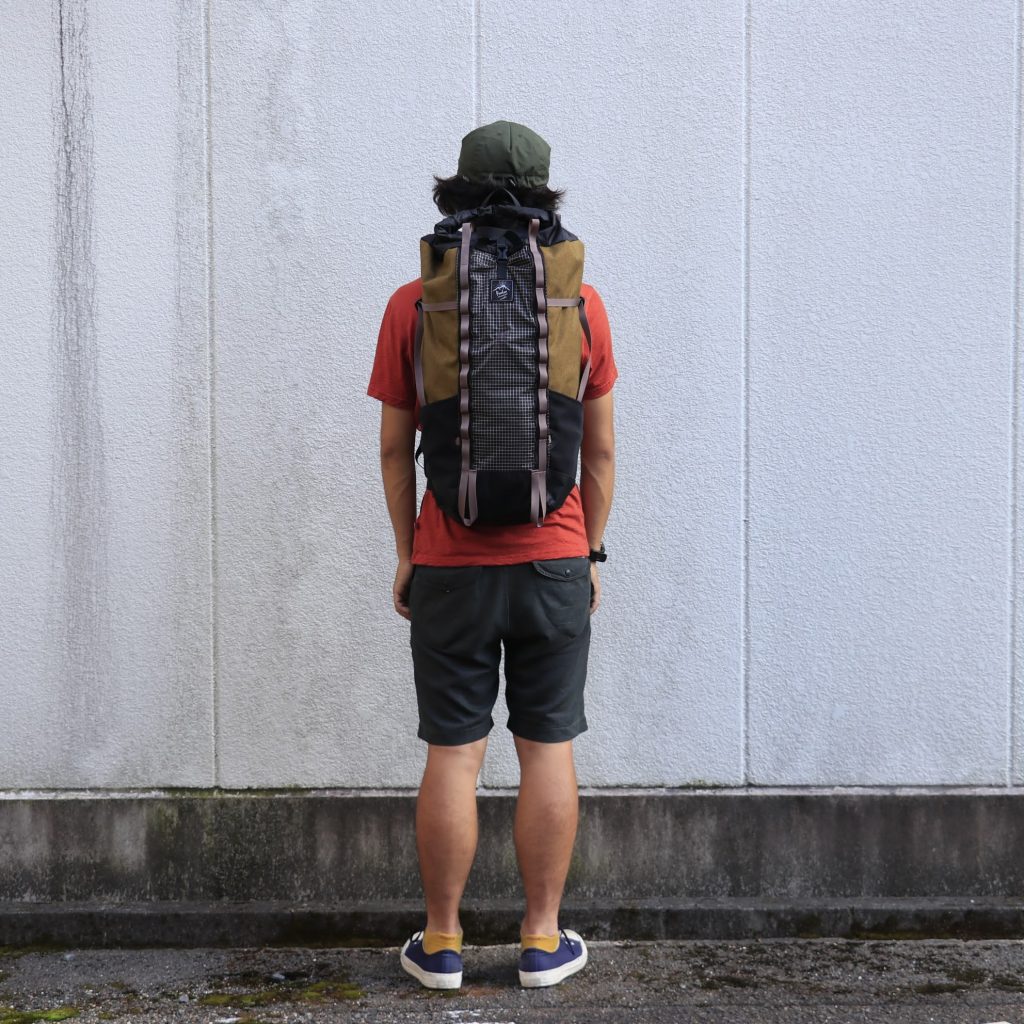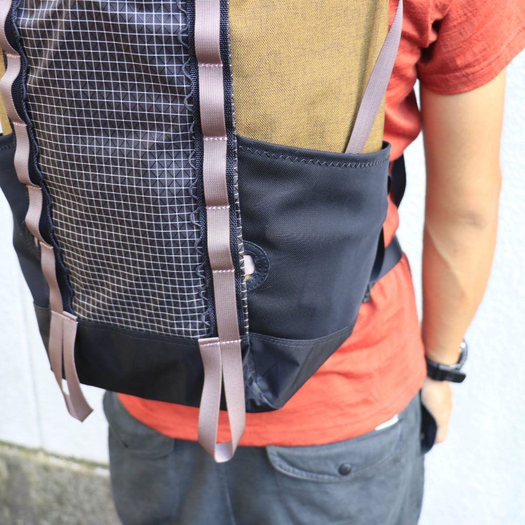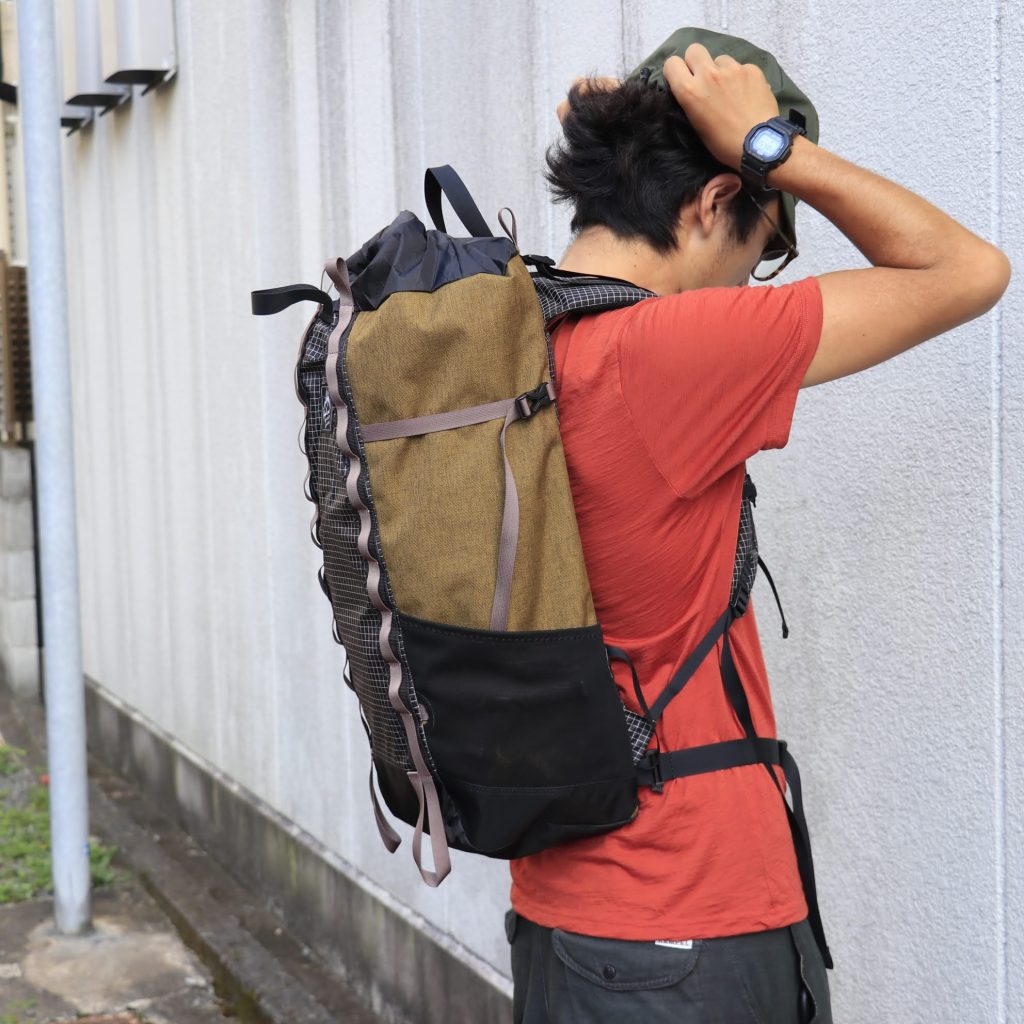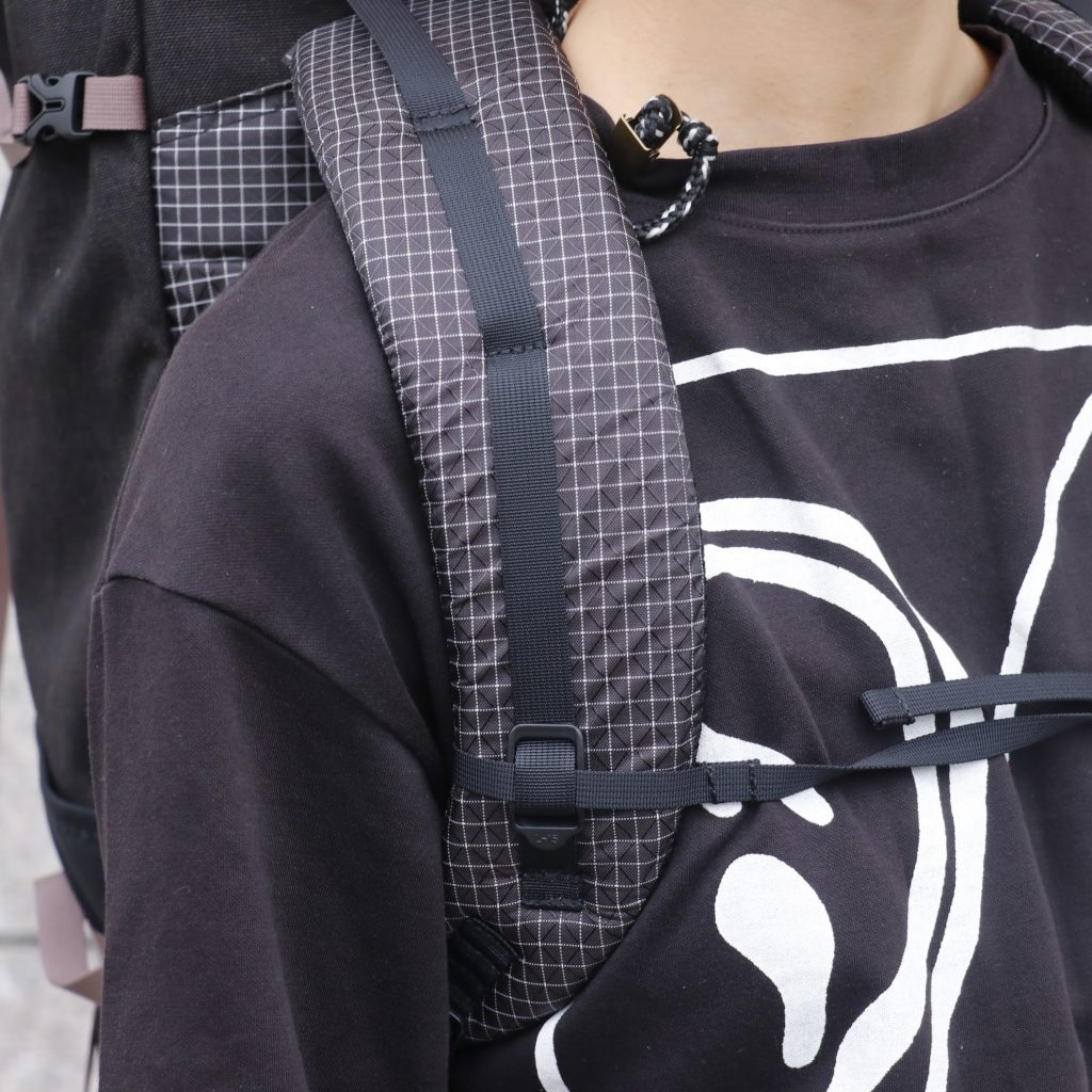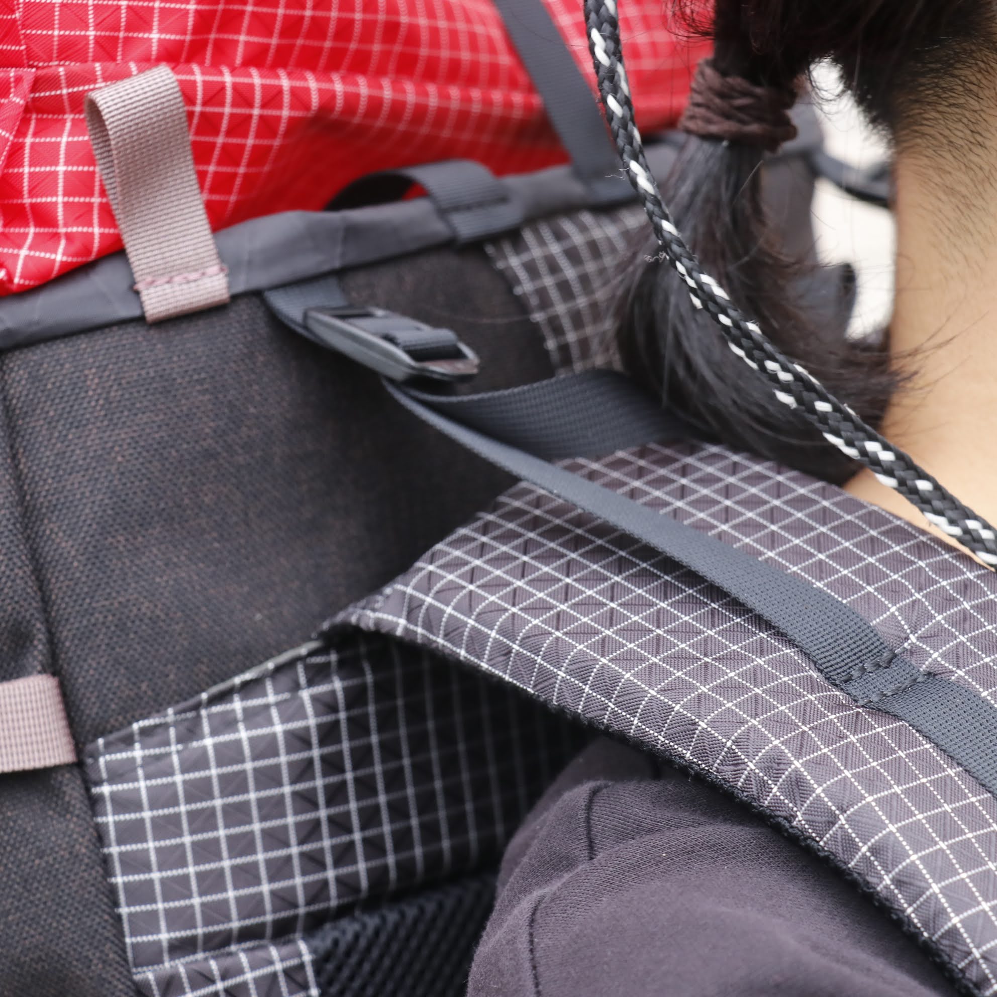 見えない部分である背面パッドやショルダーハーネスのインナーパッド類は、テストを繰り返しながら自分たちが納得の行く背負い心地に適した部材を選んでいます。はじめは少し固いと感じるかもしれませんが、ロングハイク時に疲れにくく、使い込むうちに身体に馴染んでくるように設計されています。我々が目指したのは実際の重さを感じさせないバックパック。ハーネスデザインと付け位置のバランス、インナーパッドとの相性によってバックパックの背負い心地は驚くほど激変します。ベースウエイトをいくら軽量化出来てもこのバランスが崩れてしまっては本末転倒ではないかと我々は考えています。また、我々はバックパックをおろした際のショルダーハーネスの美しいたたずまいにも拘りを持ってデザインしています。
