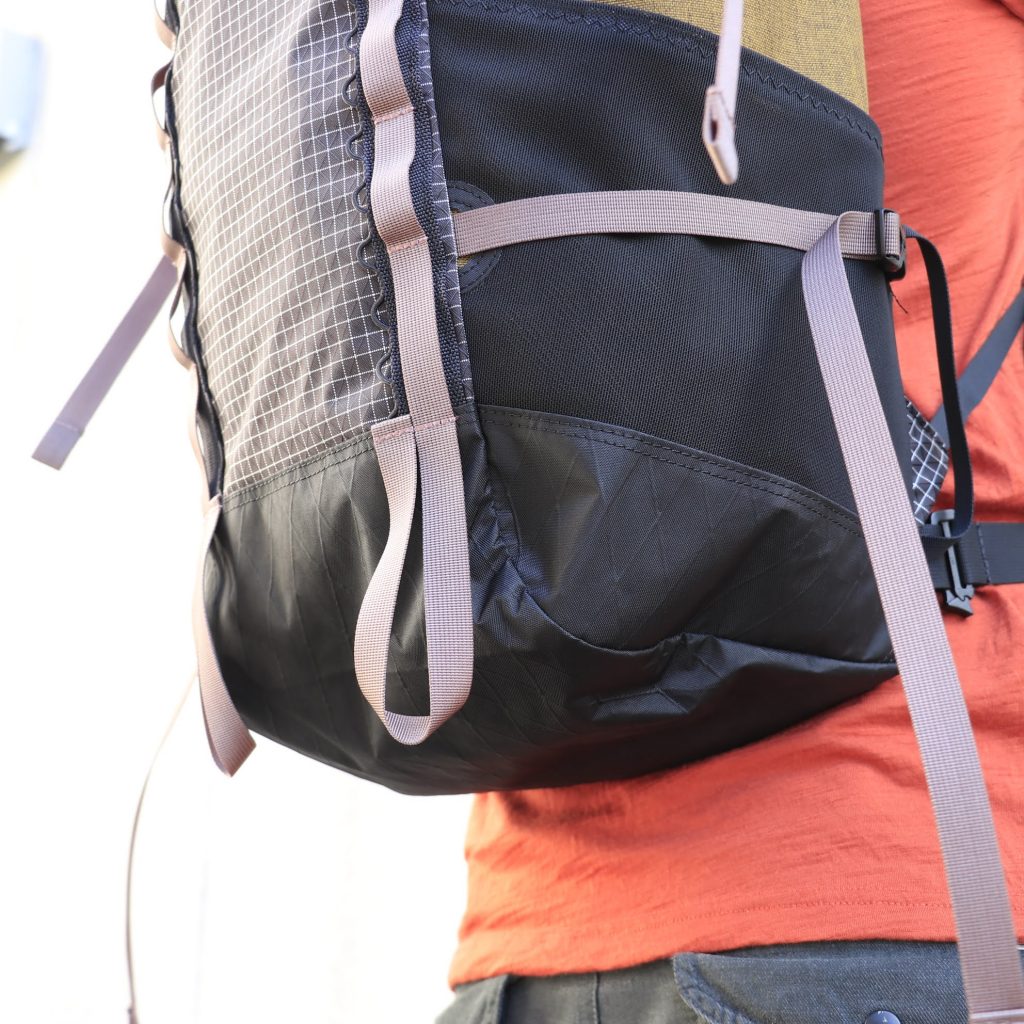 アルパインザックをベースに横幅を抑えたスリムなシルエットが特徴的で、例えば鎖場の多い岩稜帯でも引っ掛けて怖い思いをするリスクを最小限にしてくれています。