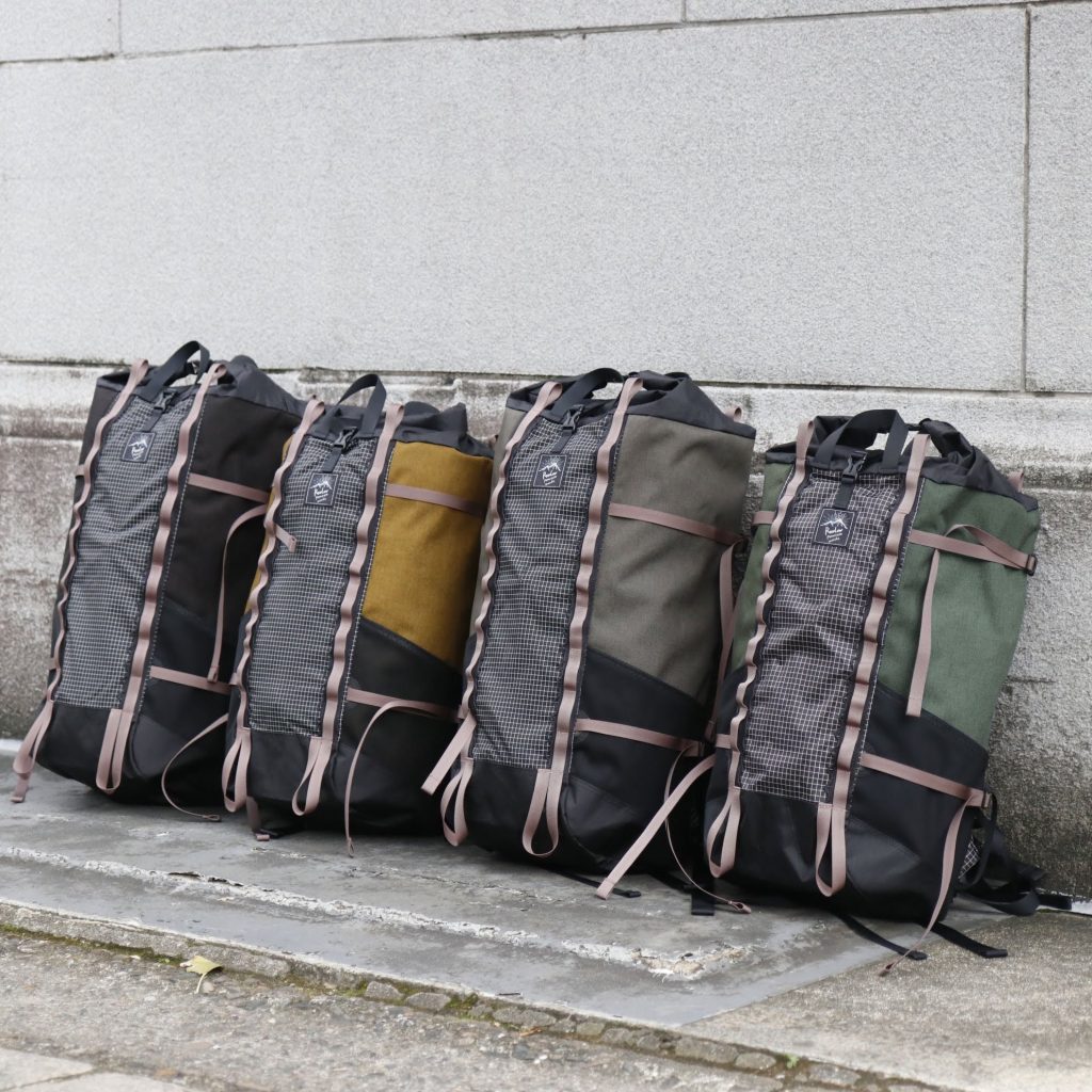メインの素材はタフな1000デニールのナイロン、80年代の古き良きヘビーデューティープロダクトへのオマージュが杢の入ったナイロンの表情と独特なカラーで表現されています。日本の山域に多い花崗岩などの岩場においてのスレなどに強く、また冬期にスキー等をサイド部分にアタッチした場合にも対応できる強靭な素材を選んでいます。冬期にピッケルやアイゼンと干渉する、フロントパネルや摩擦頻度の高いハーネス部分には割けに強いスペクトラ Grid 210Dを使用。スレが多く水に濡れる頻度の高いボトムとロールトップ部分には軽量で強く、また防水性の高いX-PACを使用しています。生産効率のみを追求するのではなく、適材適所の考え方で素材選択を行った結果、このマルチファブリックの結論に達しました。【デイジーチェーン】