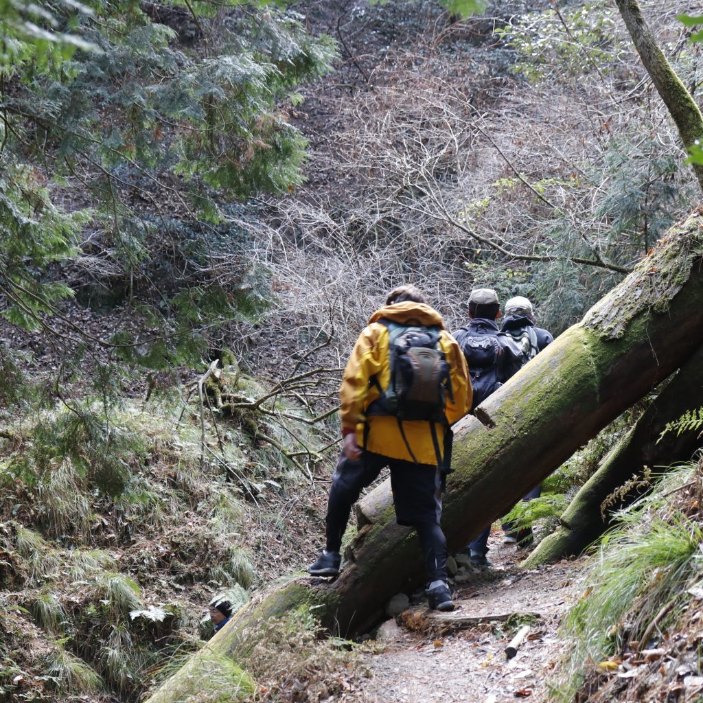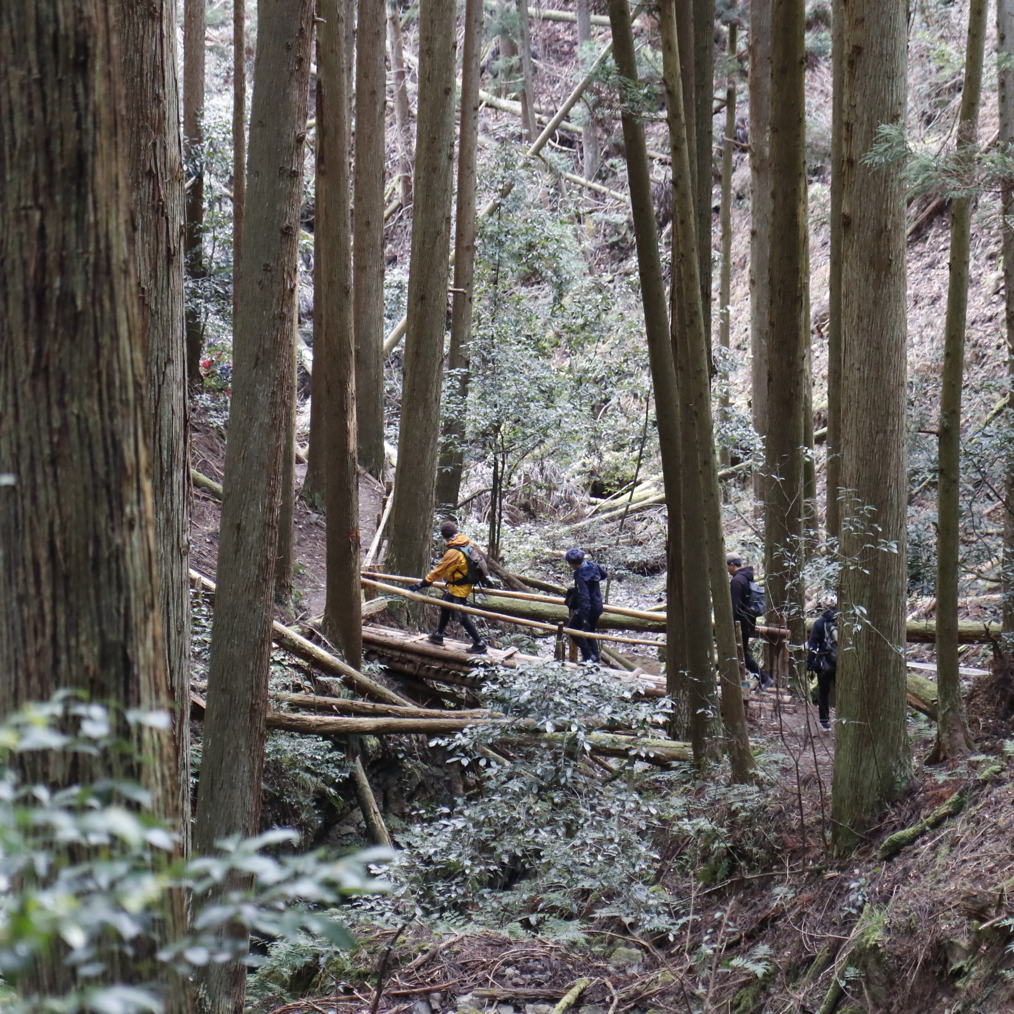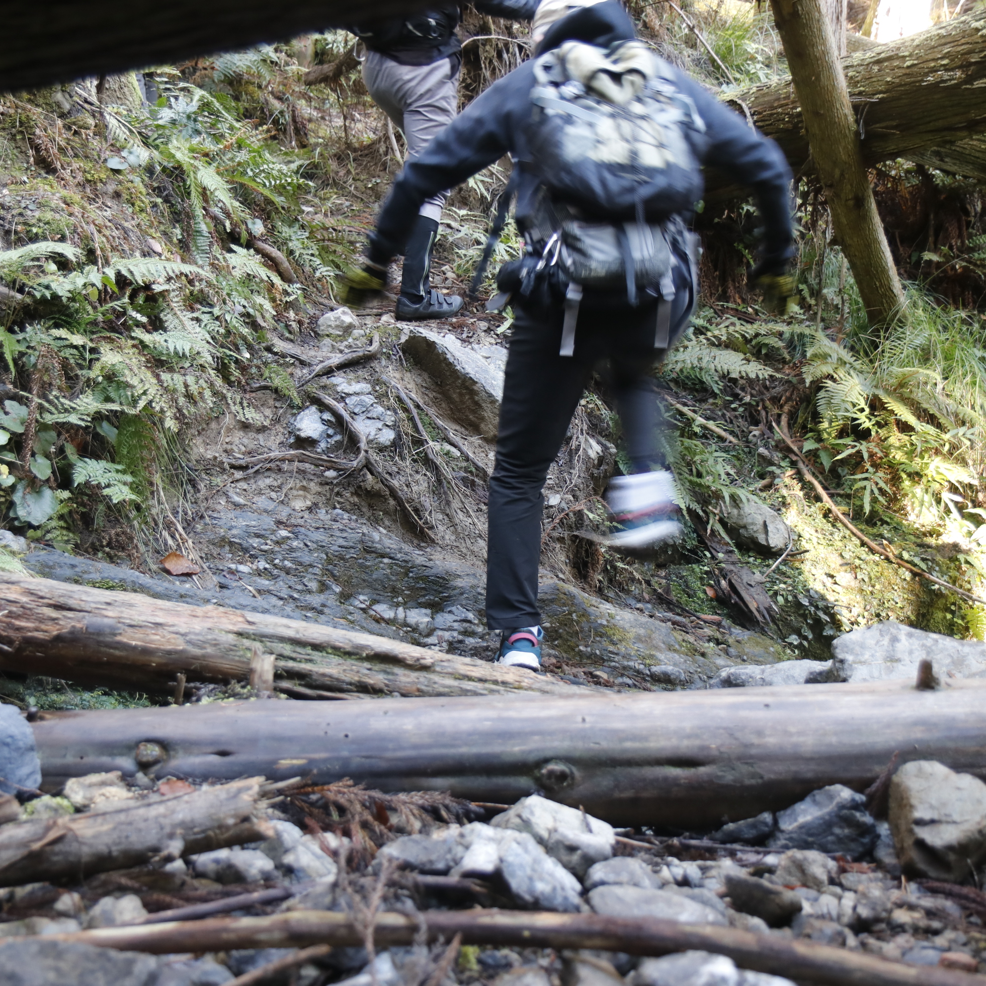 倒木を越えたり小川や不安定な木橋を渡ったり。