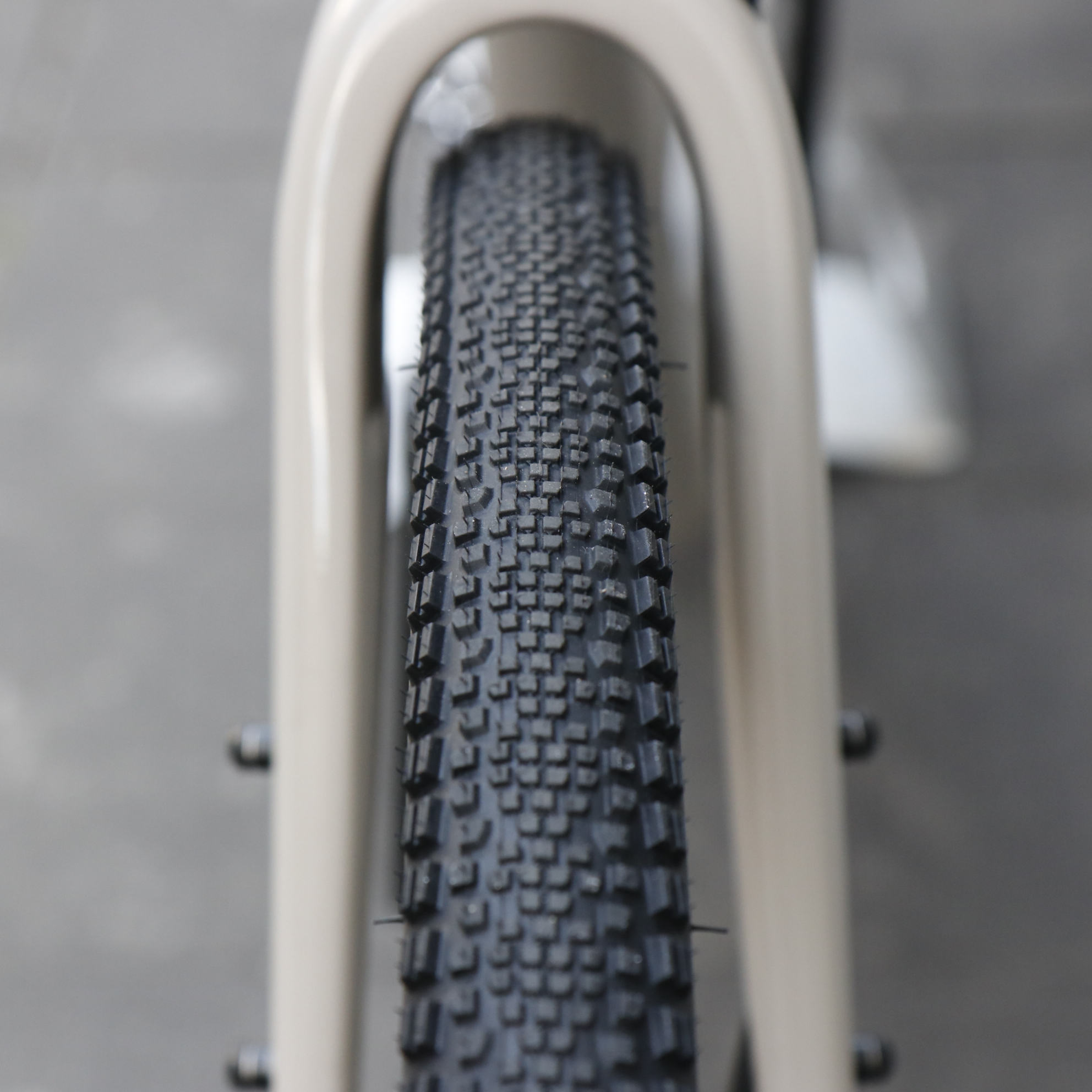 細かく背の低いセンターノブはオンロードでの転がりが軽く、グラベルバイクとしてはそれほどワイドではないタイヤですが、オフロードでは大きなサイドノブが地面をしっかりと掴みグリップします。