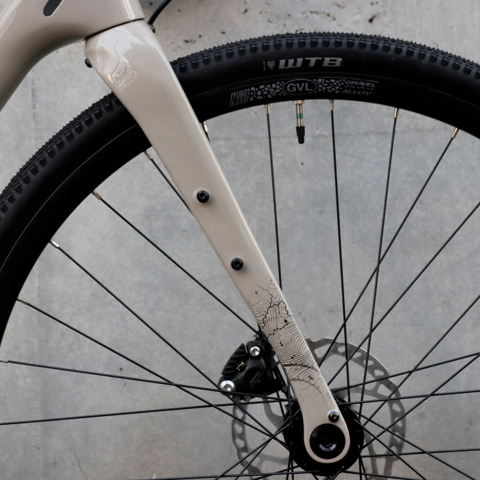 等高線があしらわれたRENEGADEシリーズ共通のフルカーボンフォークはC2にもインストールされています。