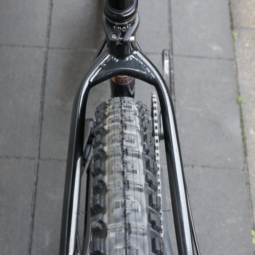 29×2.4のタイヤを楽々飲み込むクリアランスと最短417mmというロードバイクの様な短いリアセンターを実現。
