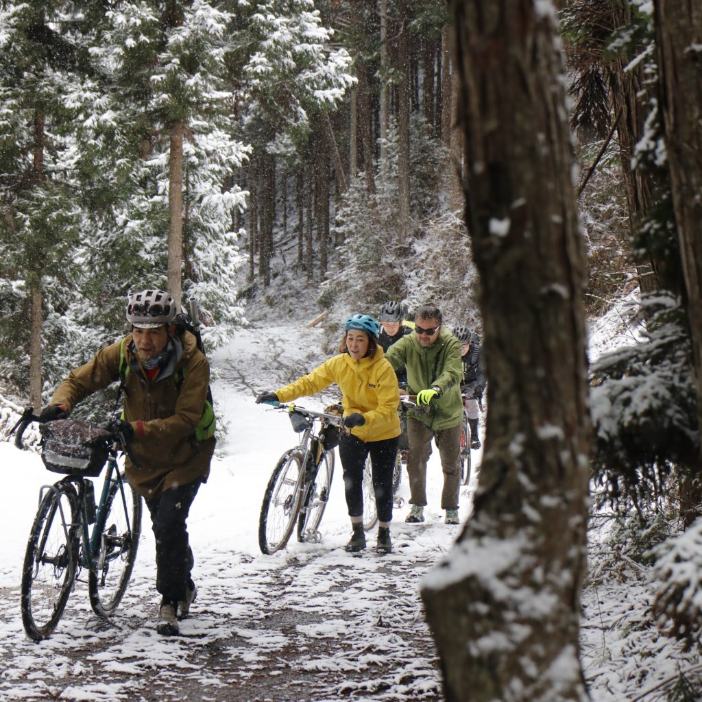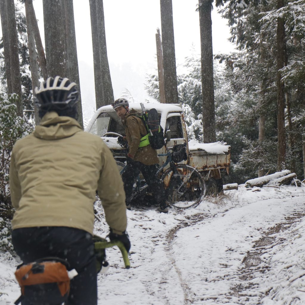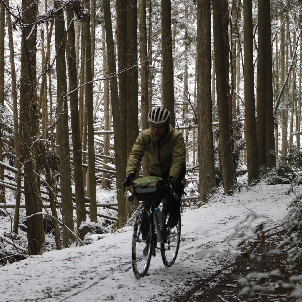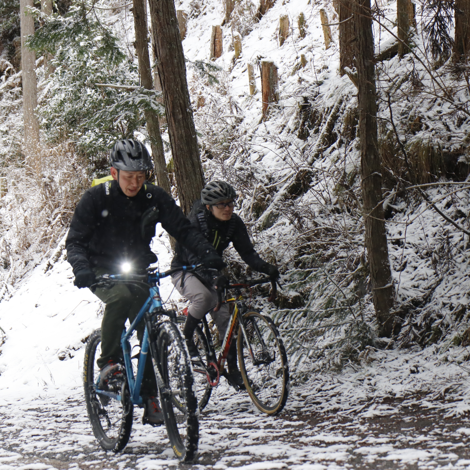 ただでさえバイクコントロールに気を遣うグラベル、積もった雪で路面が見えないのでなかなかのスリリングさ。