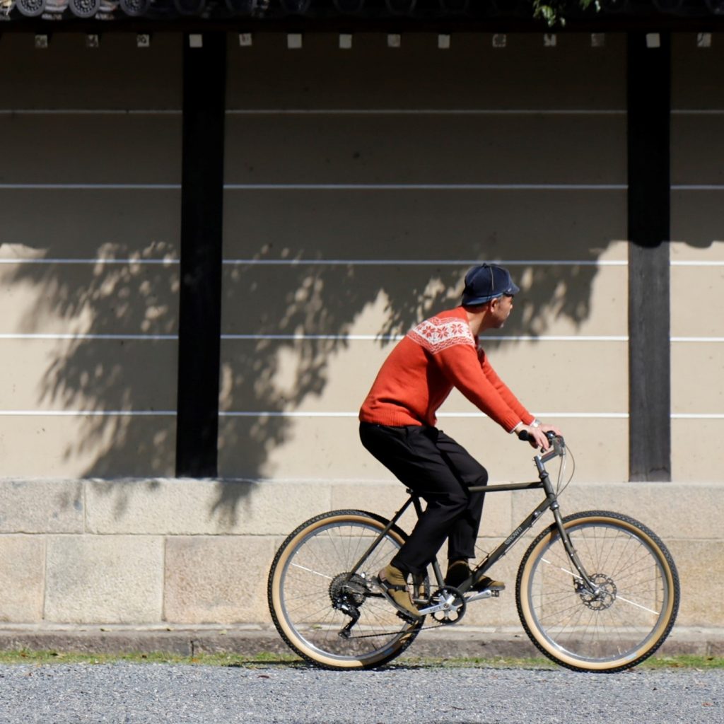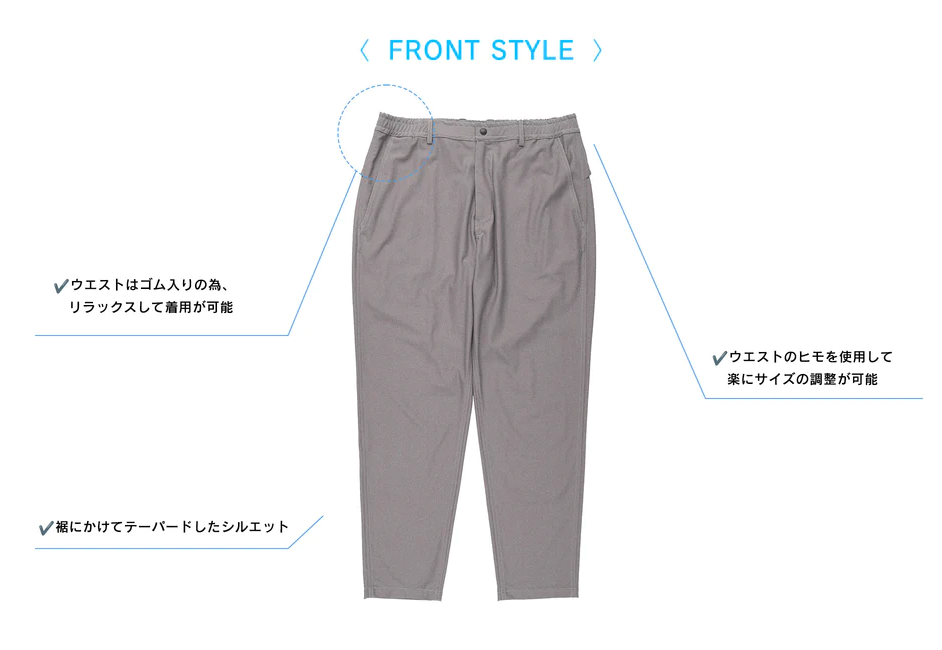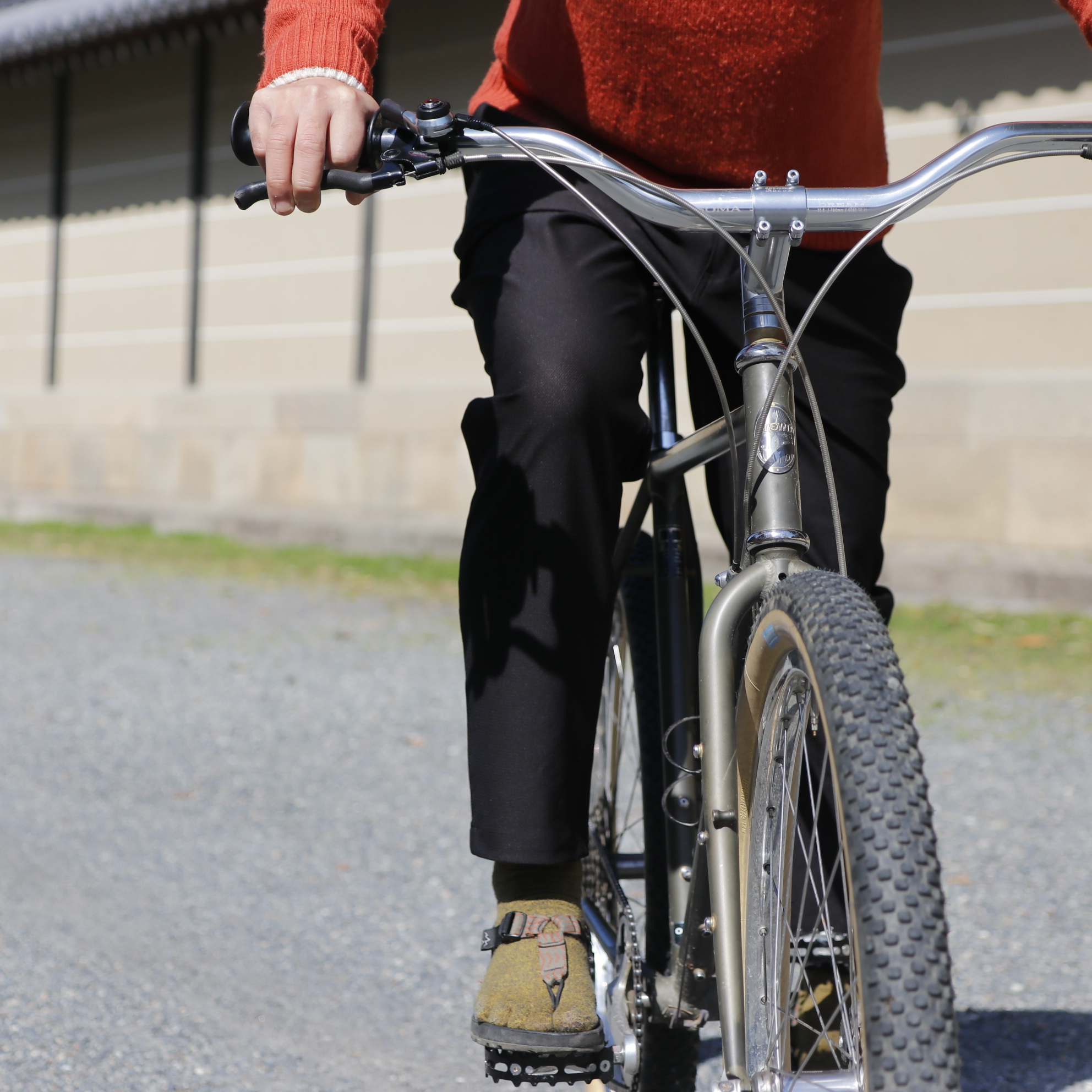 腰回りはゆったり動きやすく、膝下にかけて細くなるテーパードシルエット。裾のもたつきも無く、チェーン&ギアへの巻き込み心配もご無用。