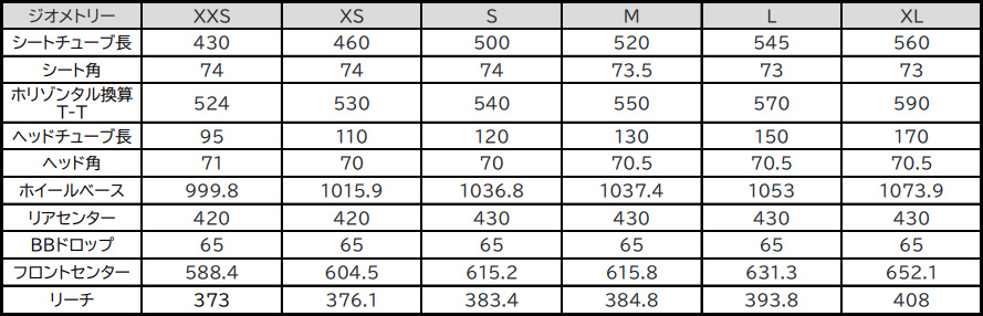 本モデルのXXSサイズは、シート:430mm(C-T)(*と言えどもトップチューブからの出代があるので実質400mm程)またトップは524mmありますが、ヘッドチューブが長い分リーチは373mmとかなり短くつくられており、設計者曰く身長150cm程~OKとの事。