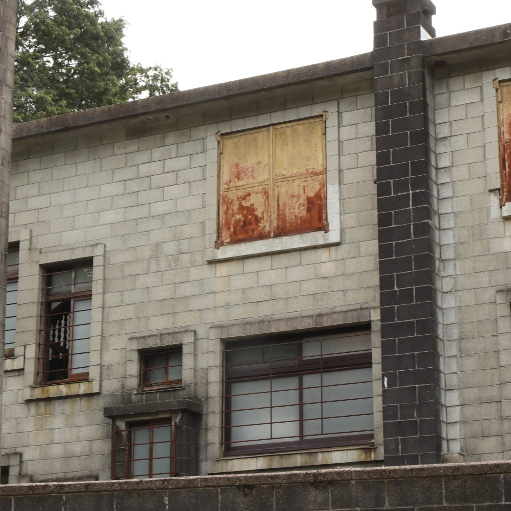 立派な建物と言えばレンガやタイル張りで美しく着飾るべし、という常識の中で、本来下地であるところのコンクリートそのものを表面に見せてしまう。