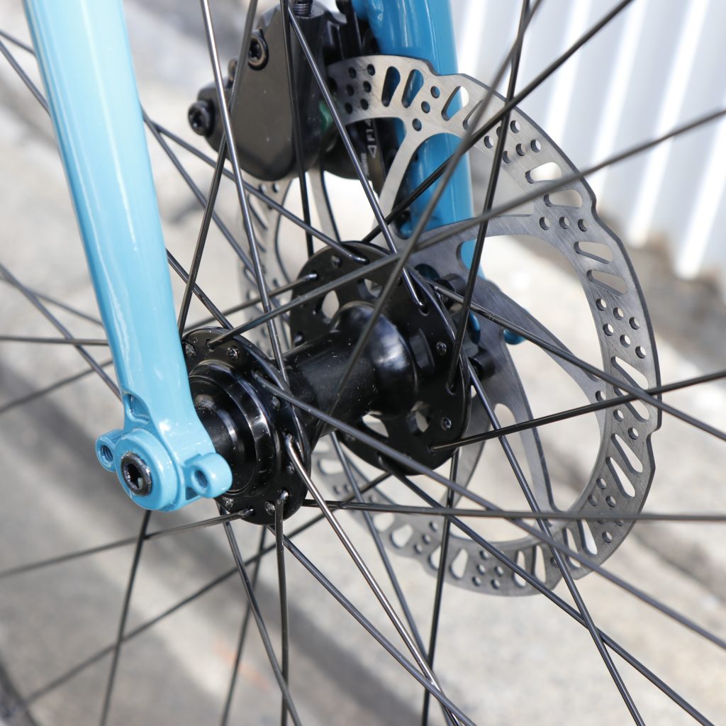 ・油圧ディスクブレーキの制動力をがっしり受け止める前後スルーアクスル仕様。