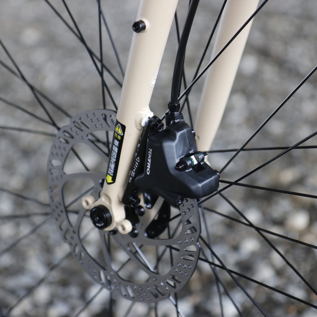 軽いタッチで握力の低い方も安心。安定した制動力を提供する油圧ディスクブレーキを採用。雨天時でもしっかり効いてくれ、街中での急な飛び出しや林道の高速ダウンヒルも安心です。