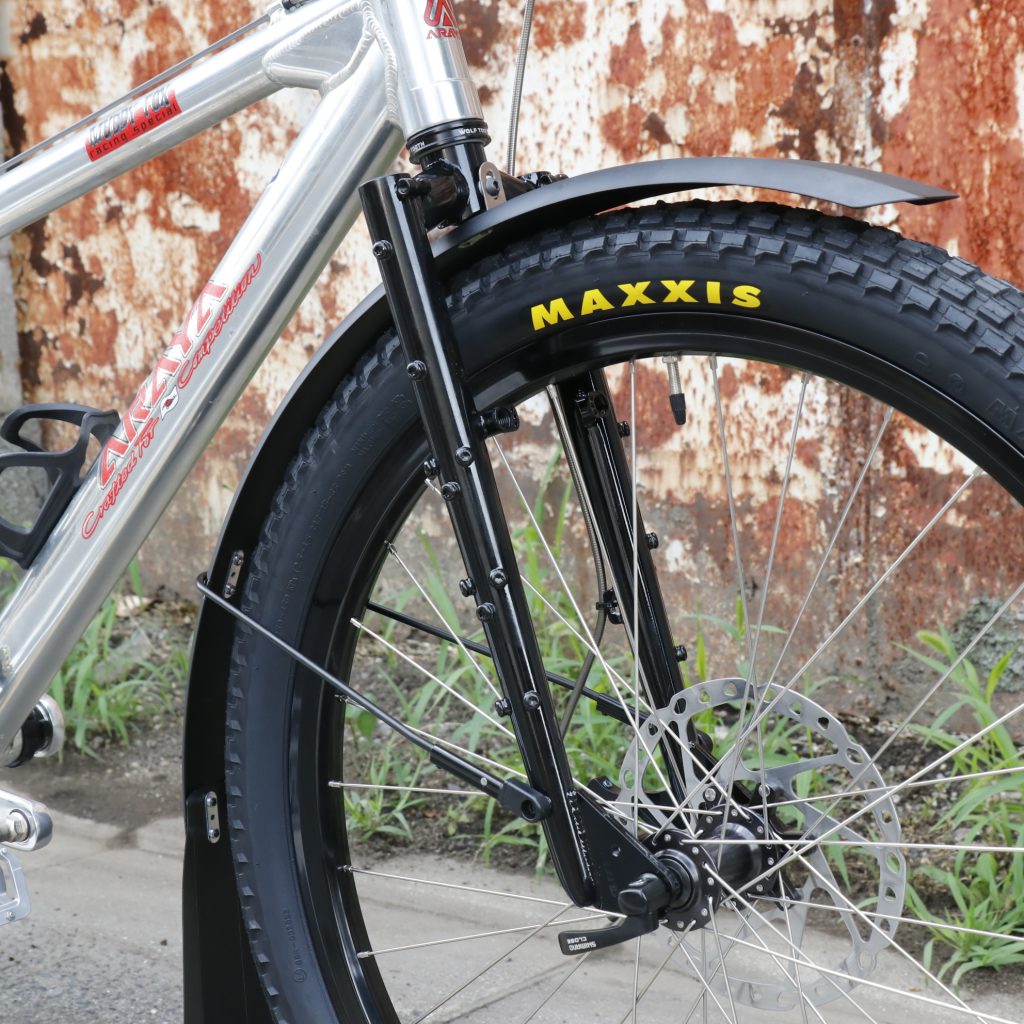 フルフェンダーには、PDW製 フルメタル・フェンダー650 を用意。画像ではお伝えし難いですが、スタイリッシュな形状をもつアルミ製の本体自体かなり強靭で、Wステー(リアのみ)で他社に比べガッチリ固定できます。様々なフレームの形状に対応する固定具も豊富に用意されており、前後のマッドフラップも標準で用意されております。今回26”という事でしたが無理なく取り付ける事ができました(幅は規定オーバーでしたがギリギリなんとか)。