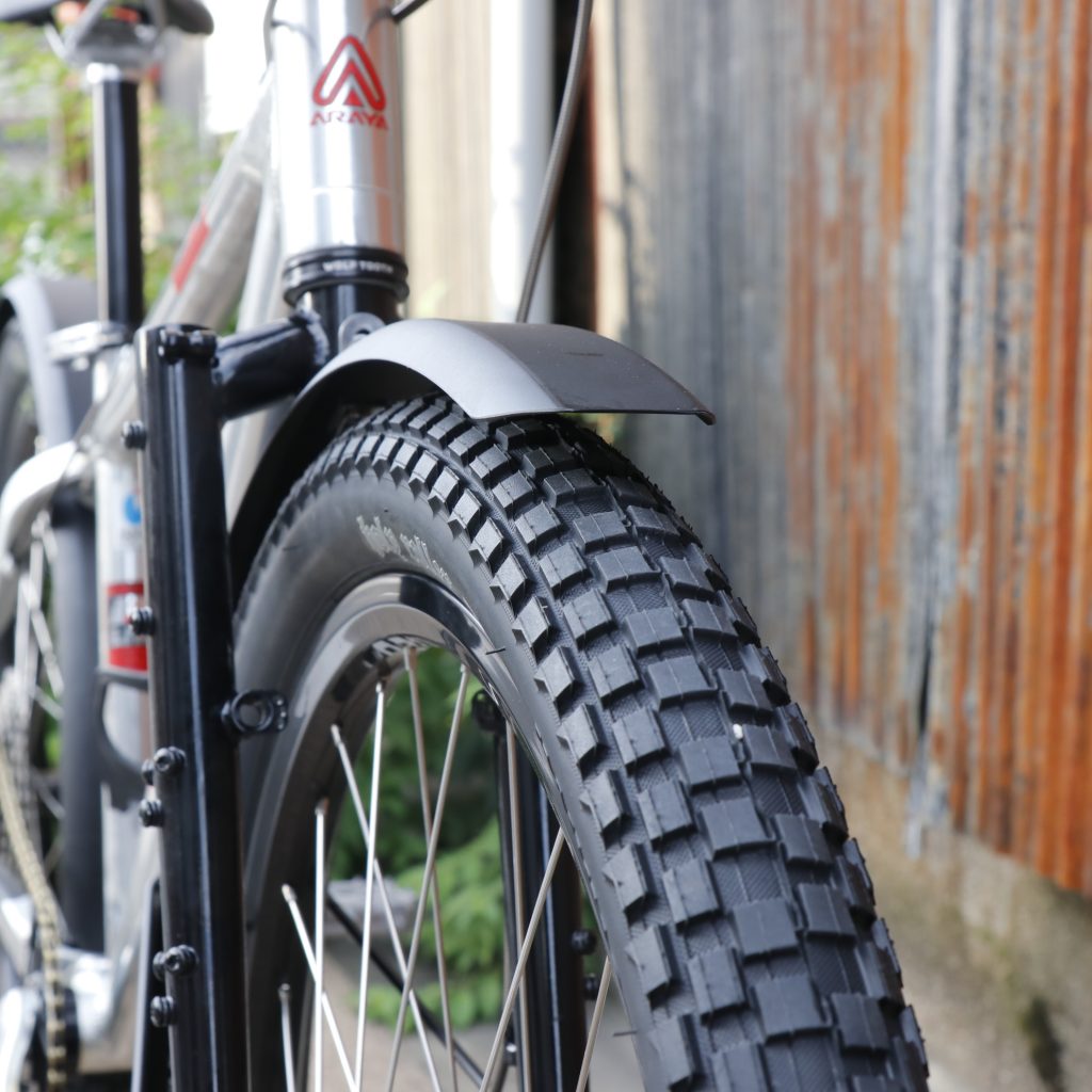 タイヤには、シンプルな□型のみのトレッドパターンが印象的。BMXタイヤをベースとしたMAXXIS HOLY ROLLER 26×2.20”。ストリートからダートまでオールラウンドに 対応する本タイヤ。今回のようなコミュータースタイルバイクにもピッタリ。