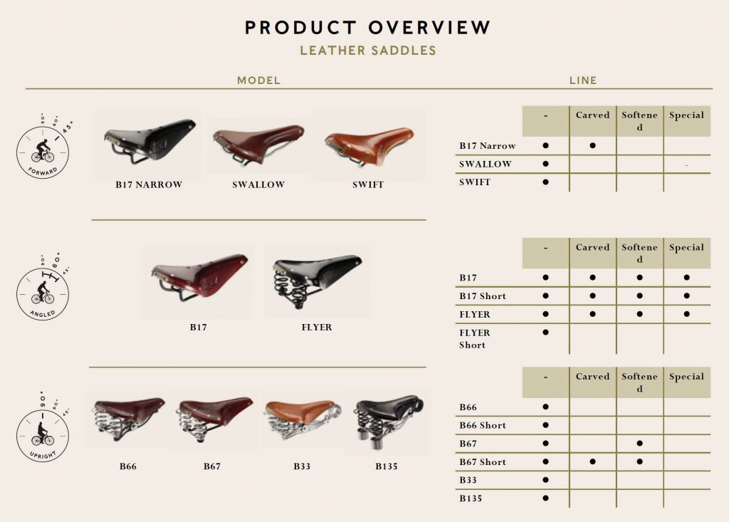 BROOKSでは用途に合わせて様々なサドルをラインナップ。よりレーシーで細身のものからより幅広でコンフォート性を重視したものなどお好みのサドルがきっと見つかるはず。